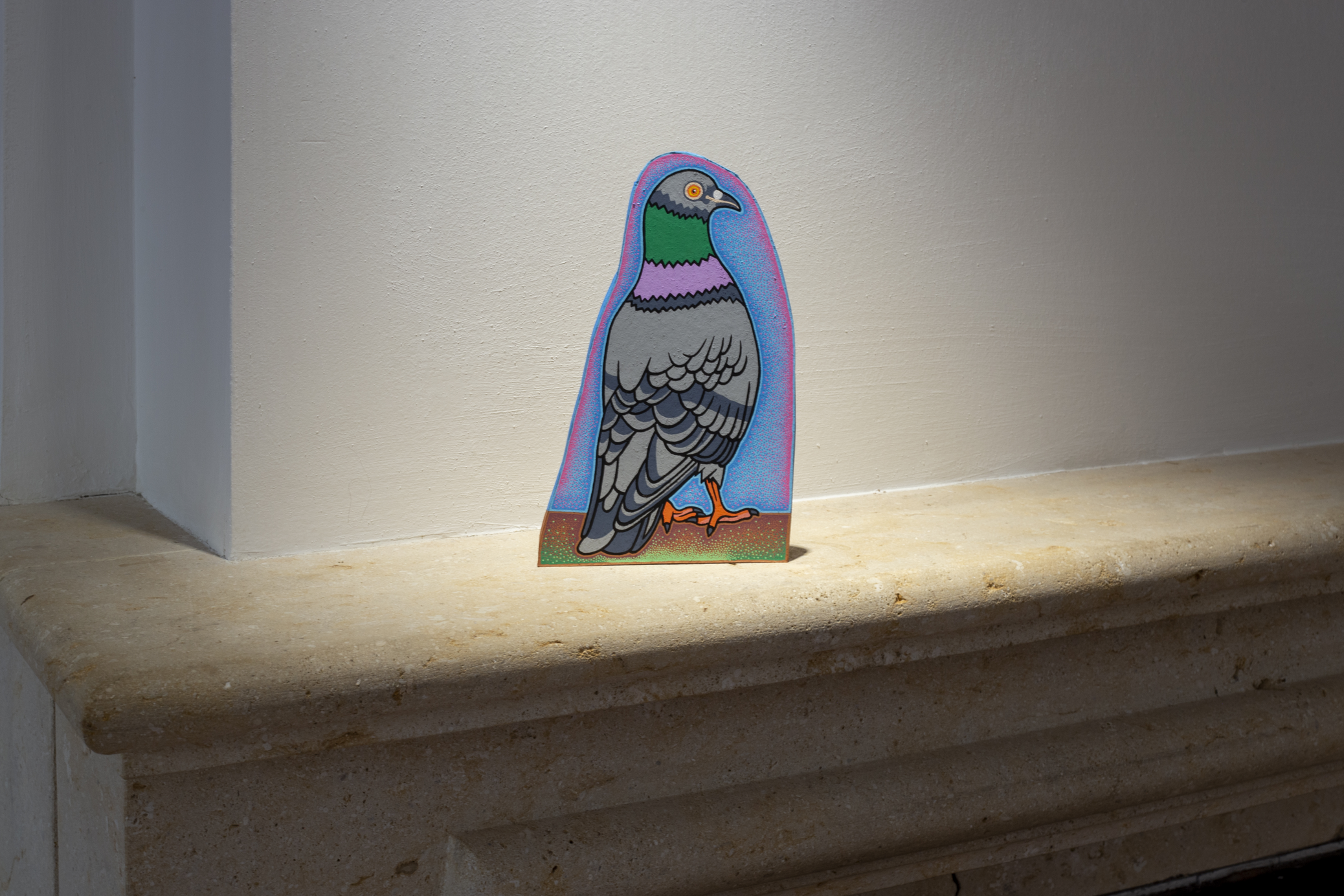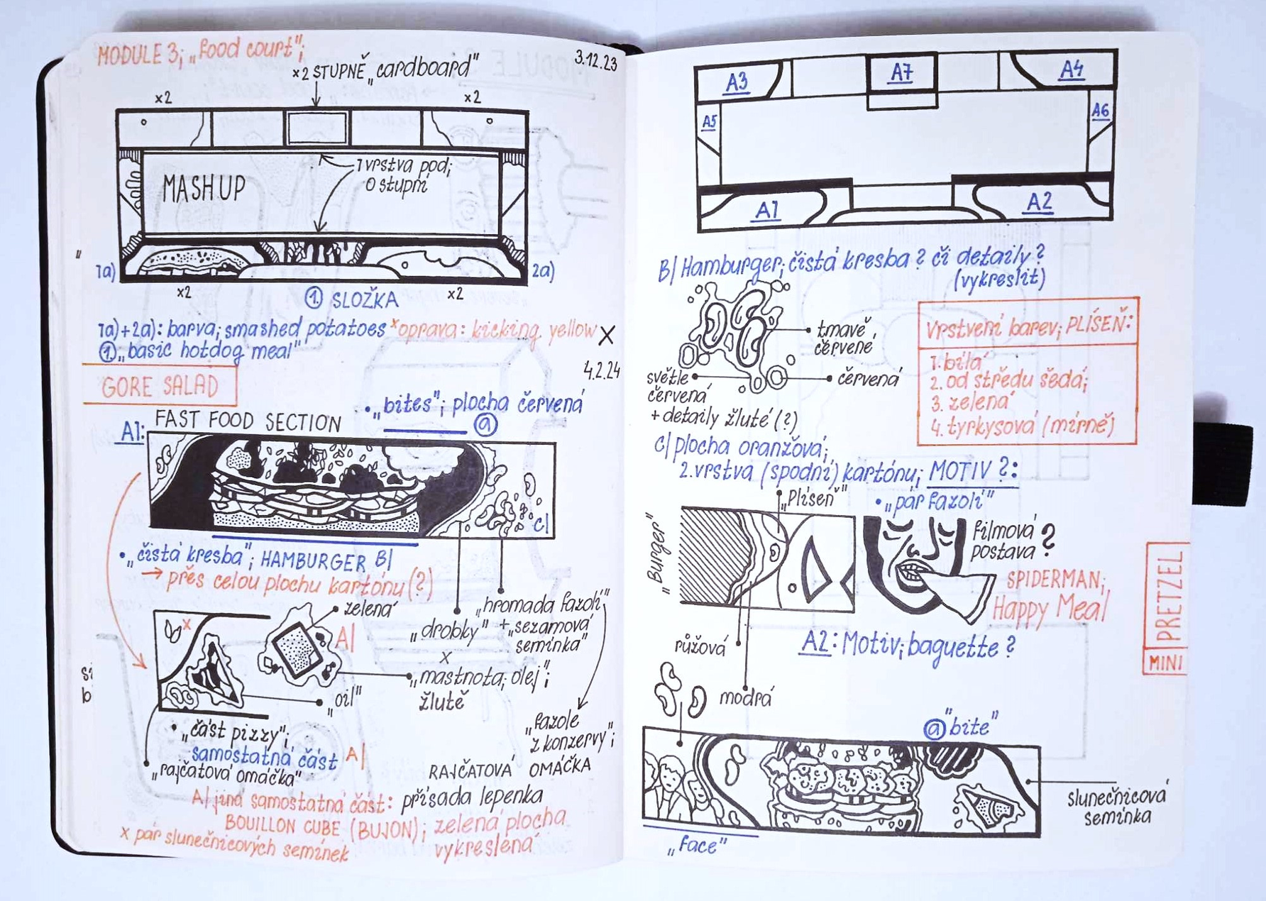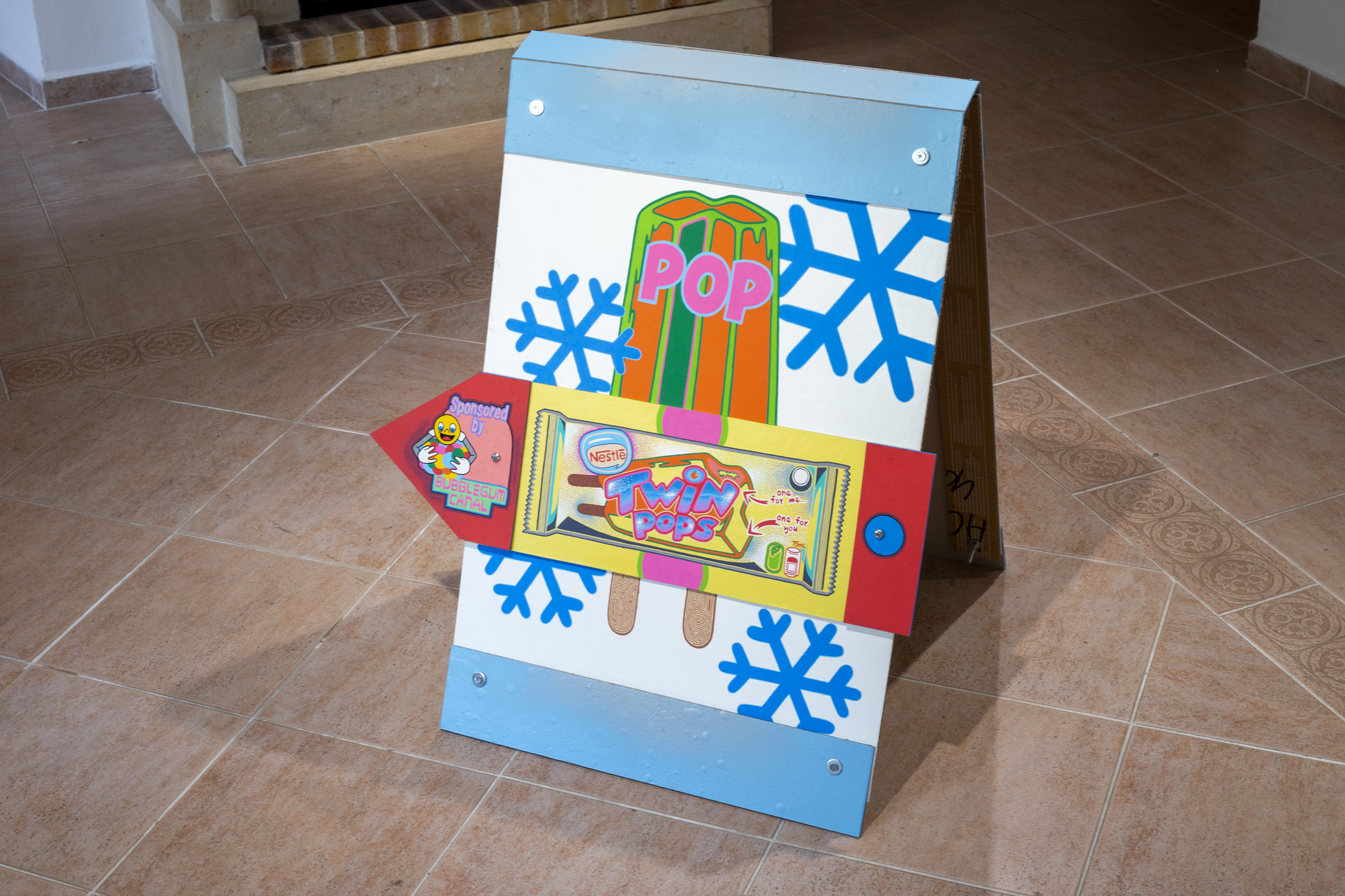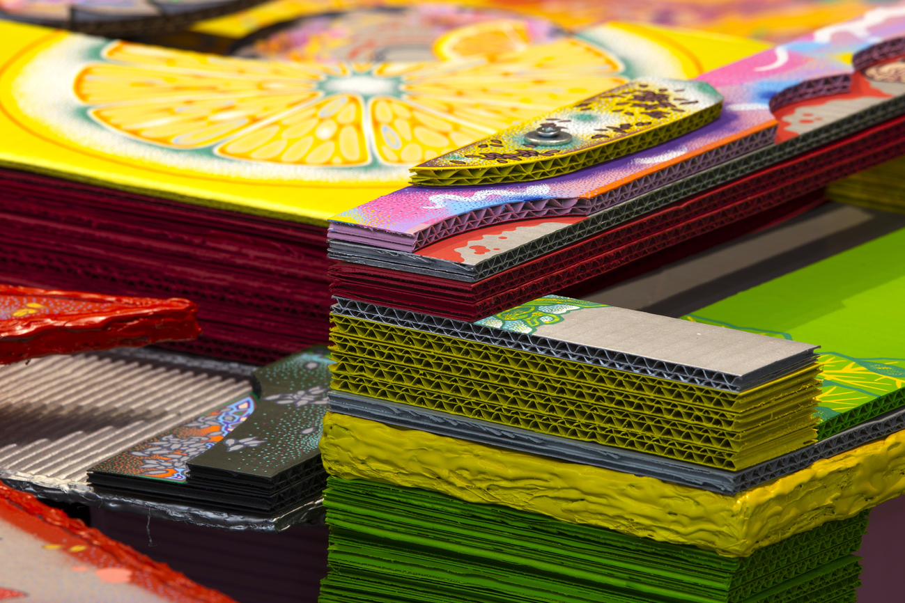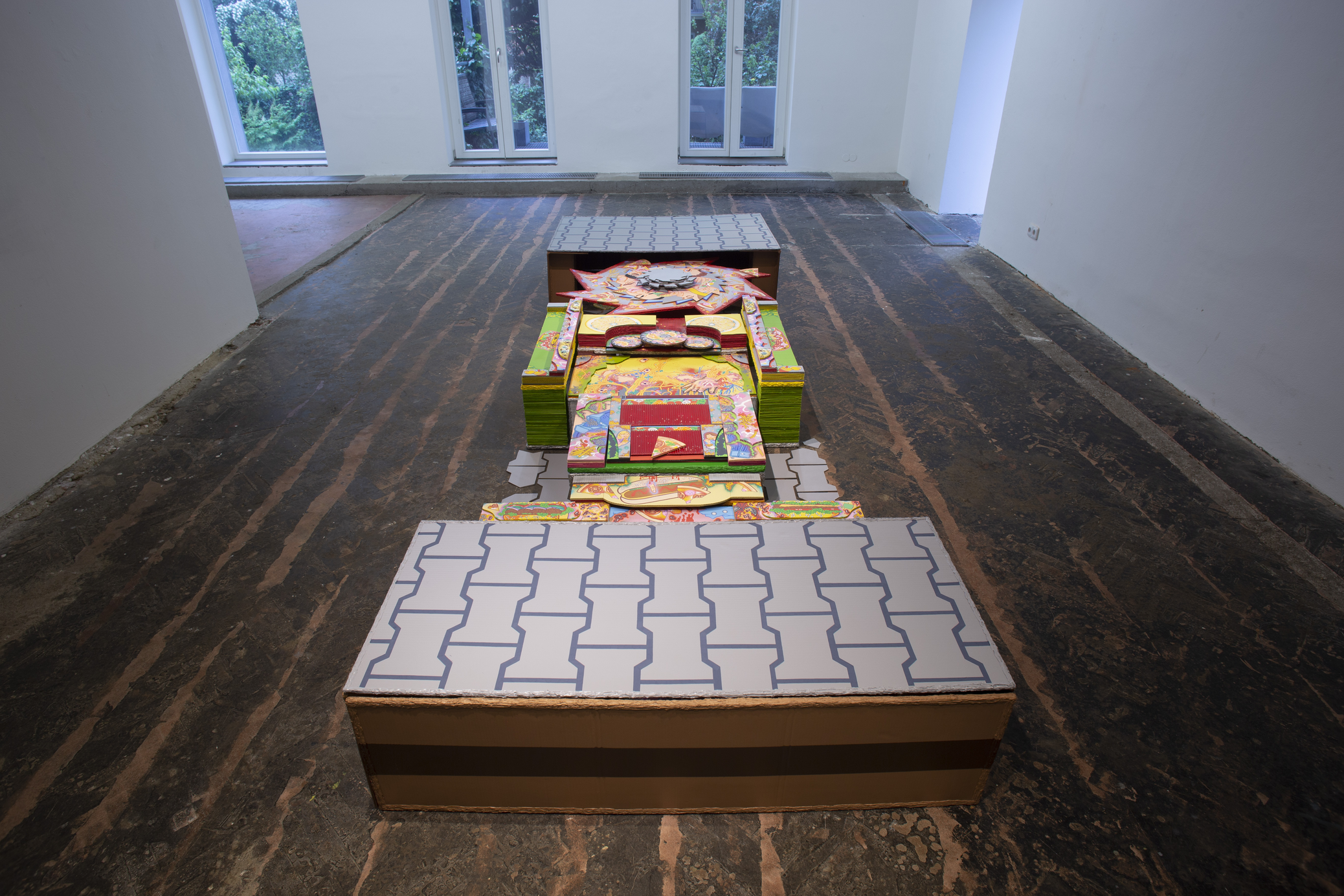 The main construction material is found, recyclable cardboard, which serves well for creating buildings and immersive installations, giving it a similar character to a film prop. Typically composed of glued layers of paper, cardboard is used for boxes and packaging, varying in thickness and strength, taking new forms—it becomes a slice of toast, a moldy baguette wrapped in aluminum foil, or a chocolate bar from a mad Willy Wonka factory. It also appears as a pizza on a slowly rotating circular wheel or a baked crust detailed with crème drawings of human tissue, crushed tomatoes, or spaghetti carbonara.