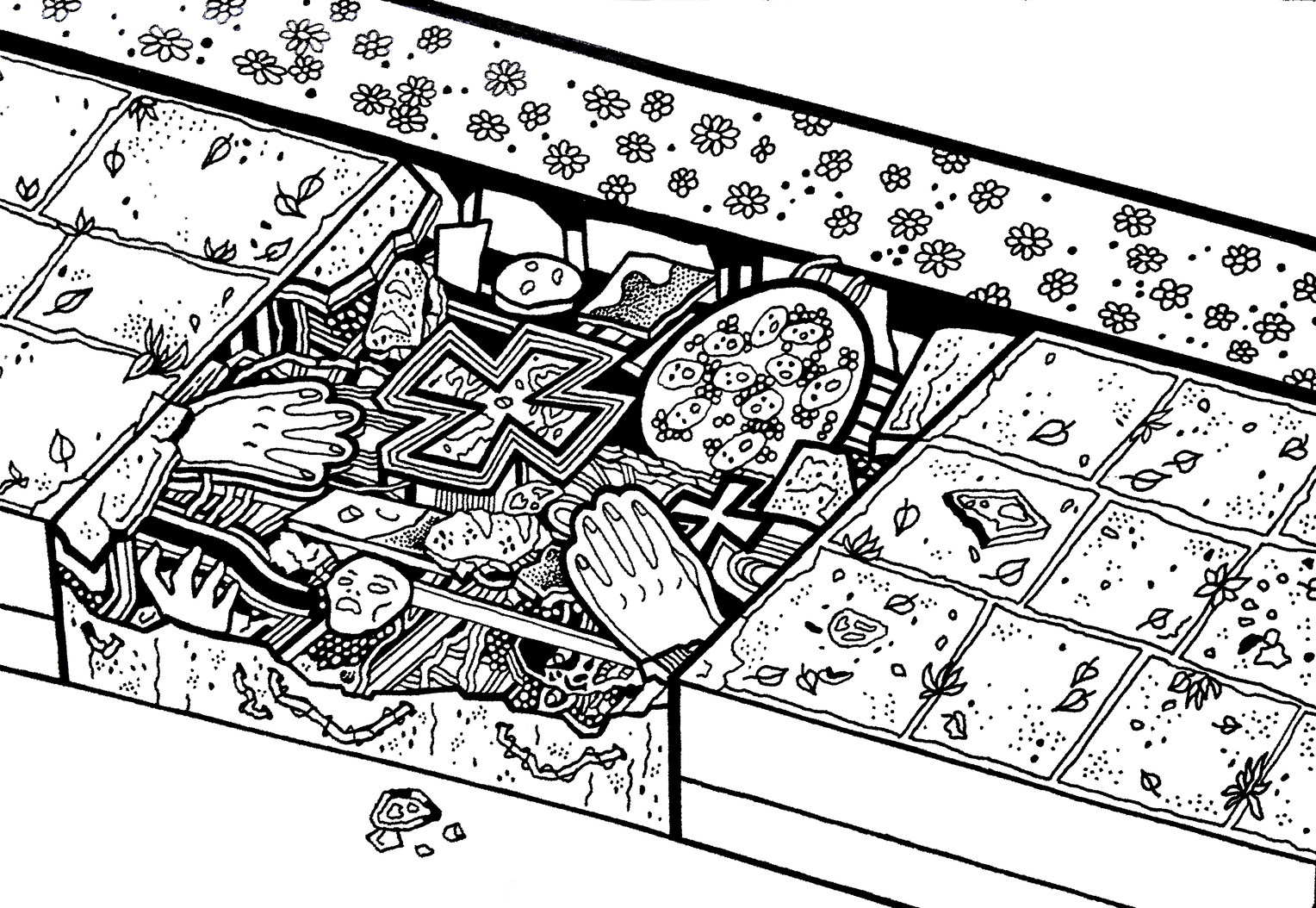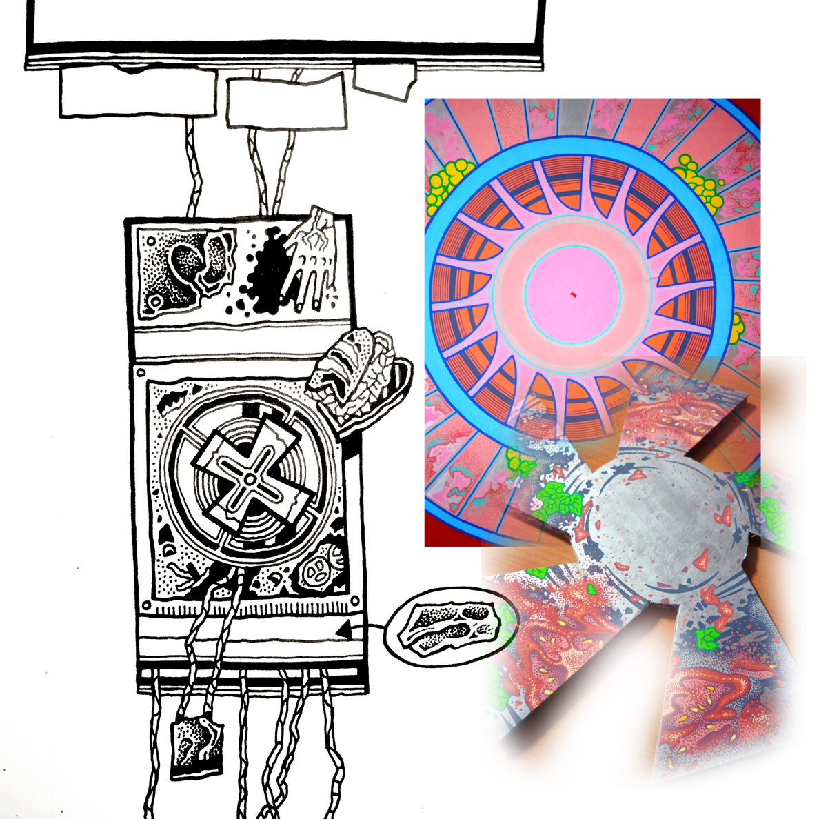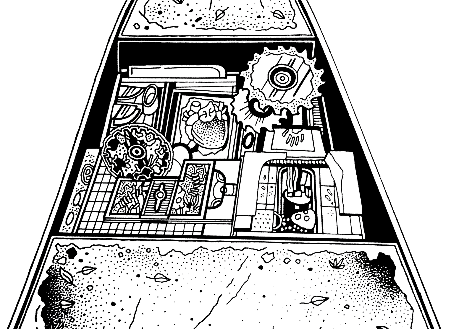 Street Gore Food presents a stylized model of a pedestrian sidewalk, made with drawing techniques, cardboard, and hot glue. It depicts a simplified section of a street that has lost its original function and has been transformed into a staged platform featuring an imaginary excavation. In this work, the street becomes a digestive system composed of imitations of kitchen appliances used to process food, forming a bizarre menu that parodies the offerings of popular fast-food chains.