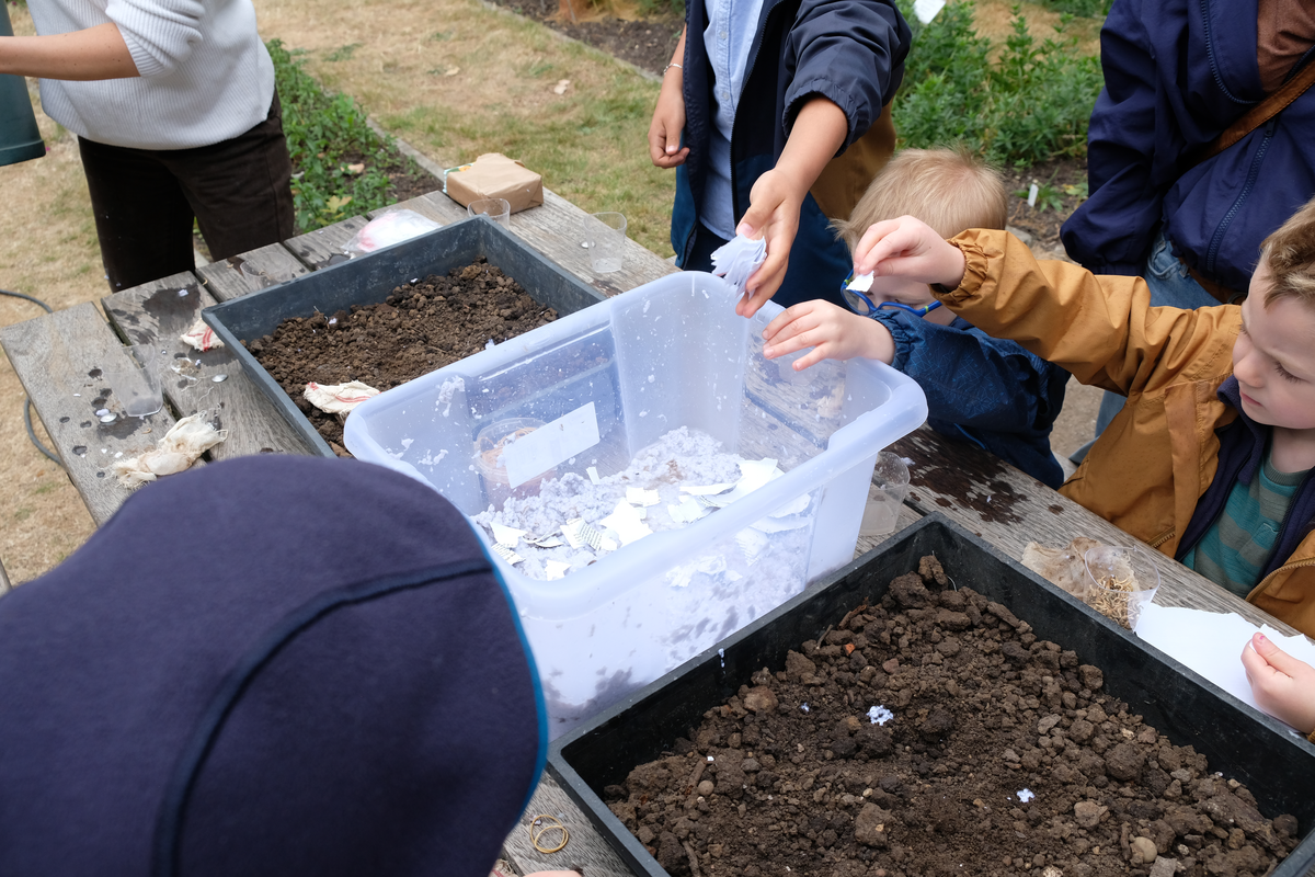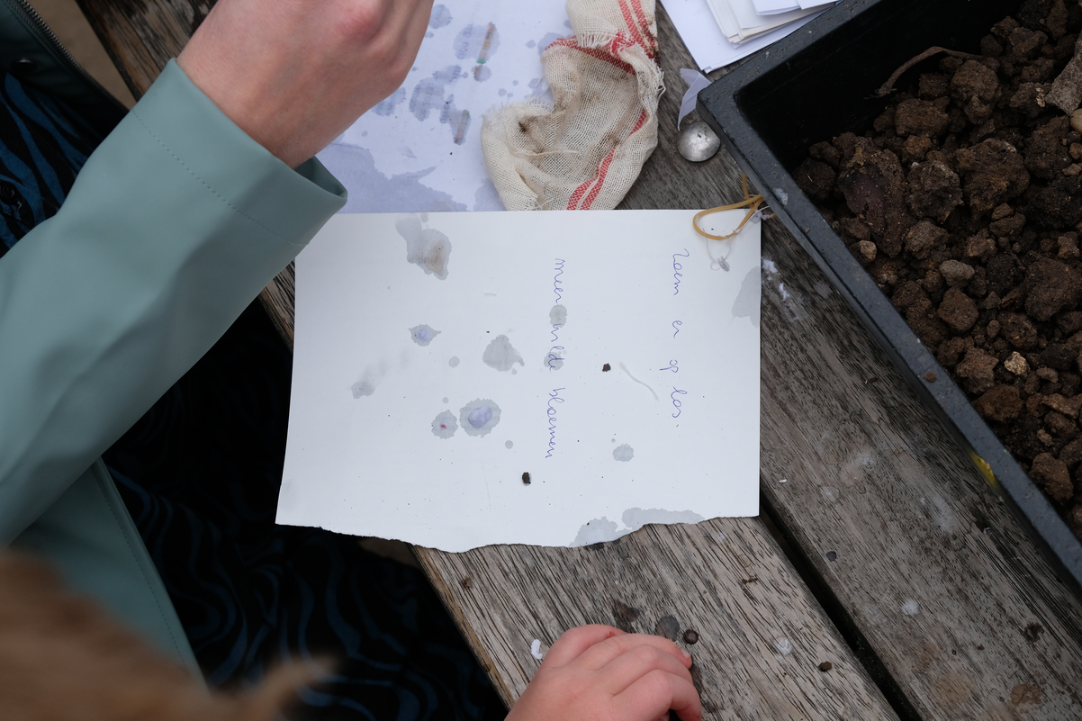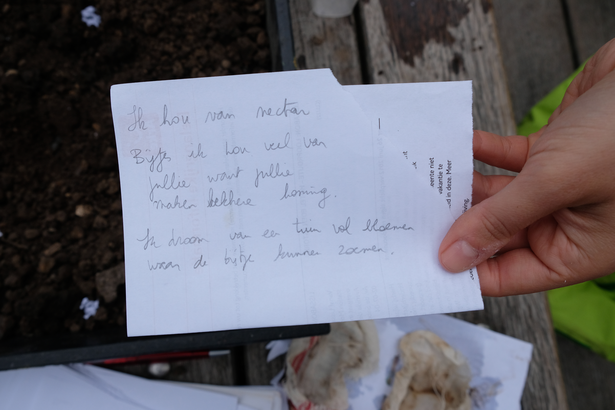 The physical presence of the hotel is amplified through a specific activity that deepens its spacemaking capacity. Human participants were invited to engage with reflective questions about the life of a bee. They were asked: What would you like to say to the bee? and if you were a bee, what would you want to express? Participants wrote their responses on scrap paper – material that would otherwise have gone to waste. This paper, once in the soil, decomposes into organic matter and carbon-rich fibers, improving soil structure, retaining moisture, and supporting microorganisms. These handwritten reflections, or drawings for those who could not write, were then mixed together into paper pulp, from which participants shaped small blobs. Flower seeds – calendula in this case – were placed inside, and another layer of pulp was added to close them off. By squeezing out the excess water, participants formed the mixture into balls. When people plant or even simply throw them onto the earth, they send their thoughts and ideas as messages to nature itself. Their reflections literally take root and grow in the landscape, extending their presence beyond words and becoming part of living ecological spaces.