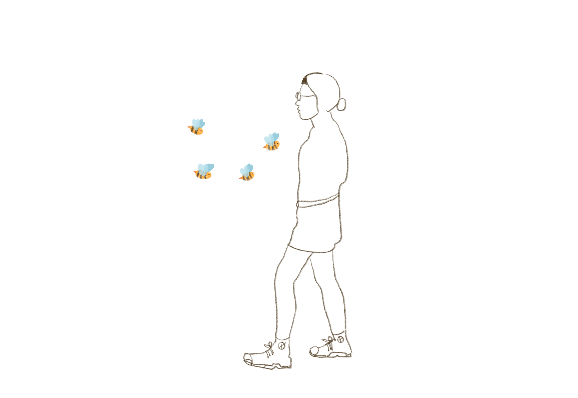 Attached to the side of the hotel is a digital screen, displaying a looping animation video of approximately thirty seconds. This animation serves as a portal into the multispecies practice that is about to unfold. It shows a cyclical process, situating the human participant within a more-than-human playground that highlights co-creative practice and emphasizes the interdependent roles of humans, bees, soil, wind, and flowers in shaping a multispecies landscape. In this site-specific practice, humans and bees are engaged in distinct yet resonant activities, together composing a space of more-than-human worlding, a multispecium.