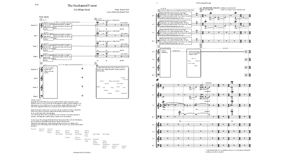 The basis for the following reflections is the research’s penultimate collaborative experiment that ran between June 2023 and February 2024 together with the choir Musa Horti from Leuven, Belgium, conducted by Peter Dejans. The goal was to “write a new piece for Musa Horti with a focus on the contact and the transitions between written and improvised parts,” a piece that would originate in “improvisation exercises and experiments with the choir” (Flick 2023c, 1), which we would carry out in an initial improvisation workshop. When reflecting on the workshop’s activities and the score of The Enchanted Forest created subsequently with the workshop’s happenings as a starting point, I became particularly interested in the very beginnings of the relational processes between the workshop and my score writing. I wondered which role the activity of listening played here.