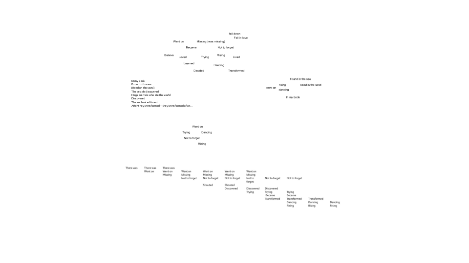 Only in the individual process of creating the score, I noticed my tacit expectation of how Musa Horti’s text creation in the workshop would inevitably resonate with me. I noticed how I had assumed to be setting text given by the singers to music, including transcribed musical material. However, although I loved the story that the choir had created, it was—in Rosa’s words—uncontrollable for me as a composer. Seeking for resonance, I instead started my work by engaging in awareness training similar to the one Musa Horti had received: sounding the musical space they had created, and trying out different contact modes through listening with different foci to recordings of the singers’ activities from the workshop. Eventually, the basis for the piece was formed by the felt resonance of the emerging relational dimensions. I created a score by synchronously developing text and sound, semantic meaning and the musical course. The following sections show examples of how the happenings of the workshop were translated.
