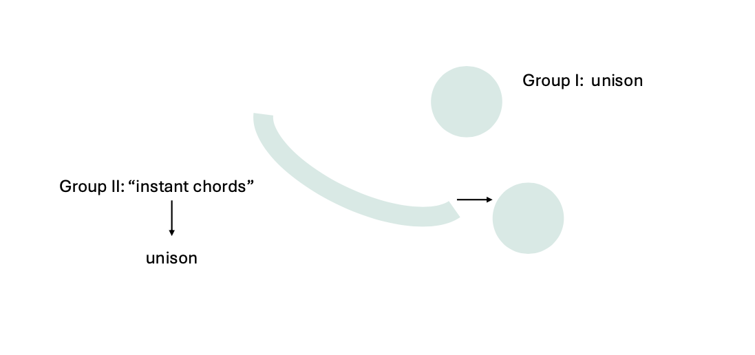 Following the introduction, we continued trying out different ways of interacting and relating through sound. One exercise was to collectively improvise a unison melody: first, one singer was leading the group and the others were following, then the situation was transformed by the choir so that anybody could introduce a new pitch. The singers developed a sounding togetherness, becoming a tentatively moving unison Klangkörper through the ongoing activity of listening-obeying-following, attuning in reference to sound color and pitch. This listening-attuning also afforded new spatial explorations: in the abbey with its long reverberation, spatial closeness was required to be able to hear well, leading to performing this exercise in smaller groups standing in a close circle and facing toward its centre. We then explored further spatial constellations, combining the unison with other interaction modes. Fig. 2 shows an example from one unison circle and one half-circle of conducted “instant chords,”11 transitioning into another unison circle. The audio example of Fig. 3 provides a recorded excerpt of this transition.