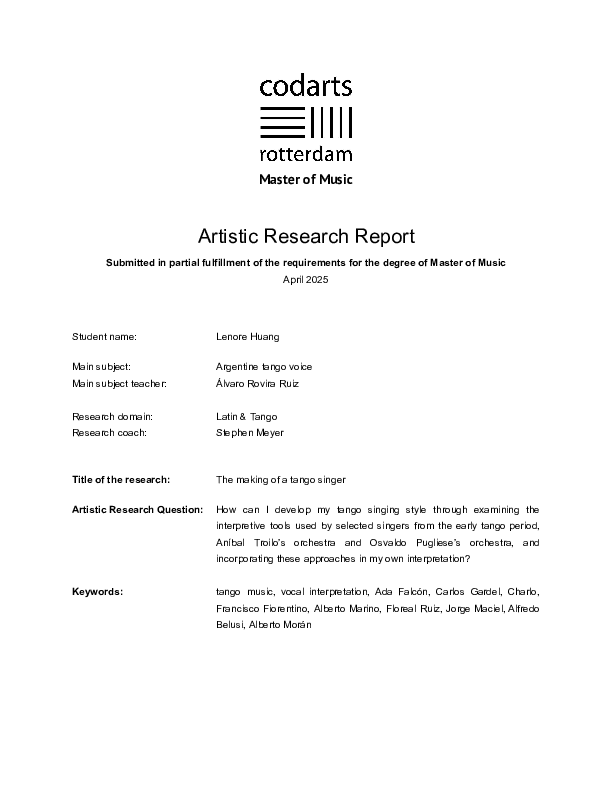 This research delves into the stylistic intricacies of tango singing, combining systematic analysis and practical experimentation. Motivated by a profound emotional connection to tango’s expressive power, the study spans three research cycles, examining – in addition to fraseo – interpretive tools such as tone, ornamentation, vibrato, dynamics, phonetic articulation, and special effects like speaking and sobbing, and how they relate to the delivery of text and emotion. Through these cycles, the researcher aims to deepen artistic understanding, refine stylistic execution, and ultimately shape a distinctive vocal style in the genre of tango. Across the three cycles, the research first carries out a panoramic and comparative investigation of the stylistic precedents set by early tango singers Ada Falcón, Carlos Gardel, and Charlo. Then it shifts focus to three singers of Aníbal Troilo’s orchestra – Francisco Fiorentino, Alberto Marino, and Floreal Ruiz, exploring their nuanced dynamic variation and its interplay with ornamentation. Finally, it delves into phonetic articulation and special effects like sobbing, chuckling and speaking as means of enhancing expressivity, drawing inspiration from three singers of Osvaldo Pugliese’s orchestra – Jorge Maciel, Alfredo Belusi, and Alberto Morán. Selected recordings are analyzed through transcription and text annotation, and re-enactment is used throughout the research process as the method of experimentation. Each cycle ends with a recording of the researcher’s performance of a piece, culminating in a rendition of Pasional as the final research outcome. By exploring a wide variety of interpretive parameters, the research fills the research gap in the field of tango singing where existing musical studies center on fraseo. It identified a considerable number of characteristics that are important to tango singing and developed practice approaches serving to internalize these features as part of one’s musical intuition. It should be possible for fellow students of tango singing to use the methodology presented in the research as a template to achieve these results for themselves.