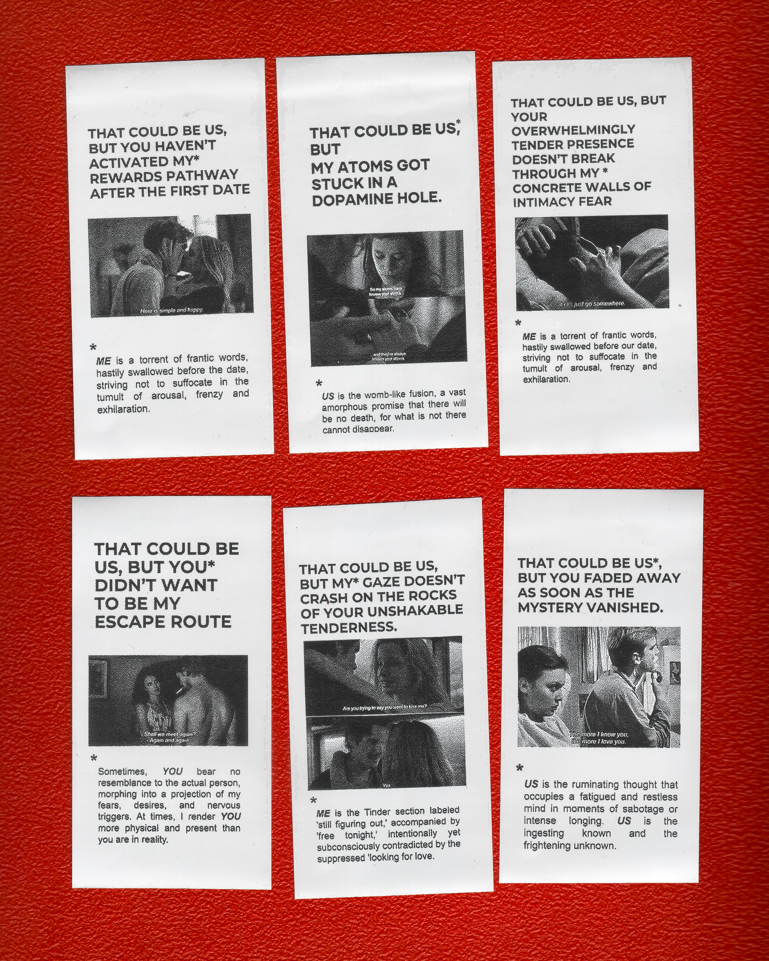 That Could Be Us is a series of text and image-based works addressing the phenomenon of fantasy bonding—partly triggered and shaped by the idealized portrayals of love in romantic cinema and the fragmented landscape of contemporary dating culture. It is both a love note and a conceptual recipe, a message scrawled on a sticky bar table and left behind for that one love (read: limerent) object.
