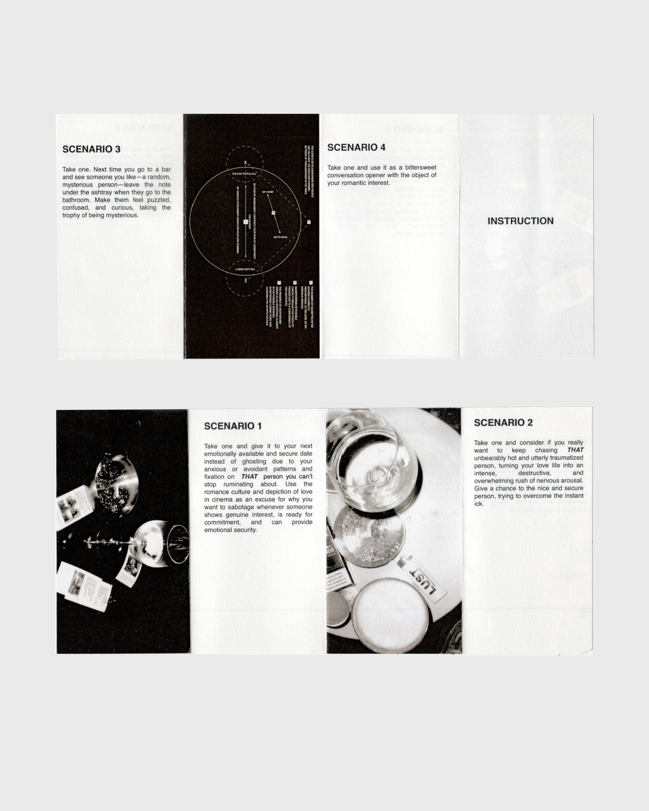 In this project, I use alternative printing methods, working with a thermal printer. Each note mimics the format of a receipt—small, disposable, transactional. Each one references a specific romantic film, which in turn reveals a distinct element or concept within contemporary love discourse as mediated through cinema. These fragments form a map of longing shaped not only by personal memory but by a collective archive of screen-induced desire.