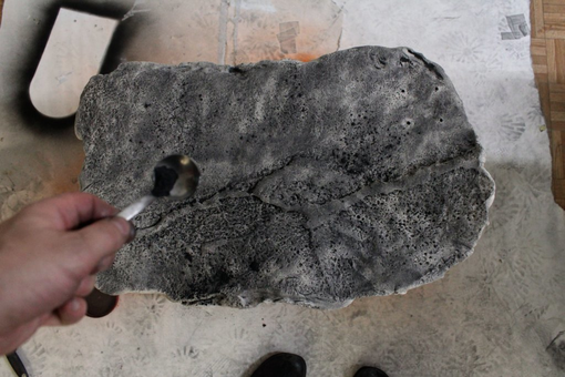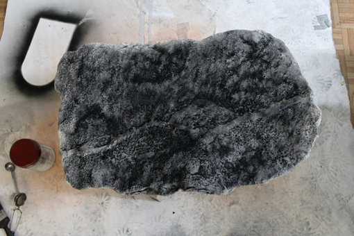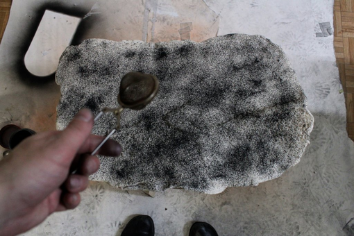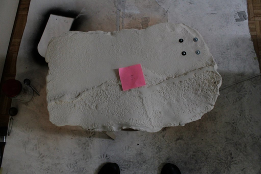 The concept of reconfiguration however entails all aspects of "a work", also its physical properties, spatial display, etc. For Pixxelpoint, we reduced the installation to contain only the ceramic prints, this time extended from five to seven plates. In October 2019, we thus created three additional prints, which came out slightly different than the old ones (thinner and slightly larger, but also the clay was of a different type or different burning temperature). We decided to add a graphite process to perhaps enhance the relief structure of the prints.