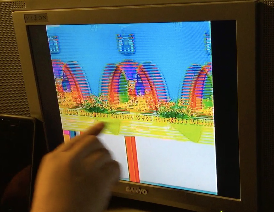 This led us to theorize that the application of low frequency interruptions to the TV tuner would cause datamoshing. Frequency is the rate at which a vibration occurs and is most often measured in hertz units (abbreviated Hz). Tapping is a low-frequency vibration that does not carry much data. Conversely, the incoming DTV signal runs through the TV tuner at an extremely high-frequency rate, carrying multiple channels of data.[2] High- frequency waveforms have a faster rise and fall rate than their low-frequency counterparts. Because low frequencies have a slower rise and fall rate, when they are introduced to the high-frequency digital television stream they offset its timing and gaps in video frames emerge before the timing system can find them – producing an effect that is akin to the dropping of I-Frames in hex editing. When we introduced low-frequency signals by tapping, we offset the timing signatures of individual video frames as they were entering the TV tuner and effectively forced the decoder to resolve the image onto a dataset that did not match, resulting in a datamoshing effect in real-time.