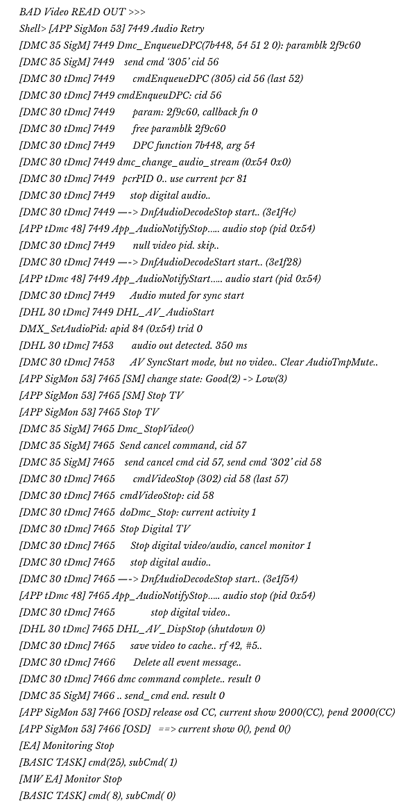 Via online searches, we found that the Digital Stream converter box utilized MicroController (MicroC/OS, or µC/OS) Real-Time Operating System (RTOS) which defines functions in C, each of which can be executed as an independent thread or task. Using a terminal-style program that provided us with text-based access to the television tuner’s MicroC/OS system, we examined the various commands that the box would execute when strong and weak signals were being received. A string of code— “Periodic Signal Check” —would be listed when “good video,” or a strong signal, was being received. We also noticed that when we disrupted the signal too much that a “bad video” notification would appear, and both audio and image would turn-off and attempt to resync. This led us to speculate that if we could turn off the converter’s ability to resync “bad video” that we would be able to receive a continuous image no matter how much we disrupted the signal.