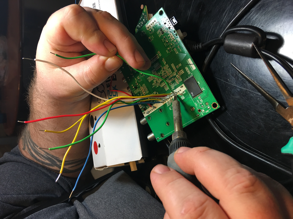 Unlike hex editing or live camera datamoshing apps, we would be dealing with a set of unknowns as we attempted to datamosh the incoming digital broadcast transmission; for example, we would not have control over how the digital broadcast was being encoded/compressed on the transmission side, nor any knowledge of the codec or software language utilised by the converter box.[1] With the various methods of early video artists and contemporary datamoshing artists in mind, we decided to explore three diverse techniques to disrupt the digital broadcast signal before it reached the decoder: software hacking the box’s built-in code; circuit-bending or hardware hacking the circuitry of the box; and external interruption of the electrical components that were hardwired to the box. We also considered that it might take a combination of all three methods to achieve datamoshing. We experimented with each technique to different degrees of success.
