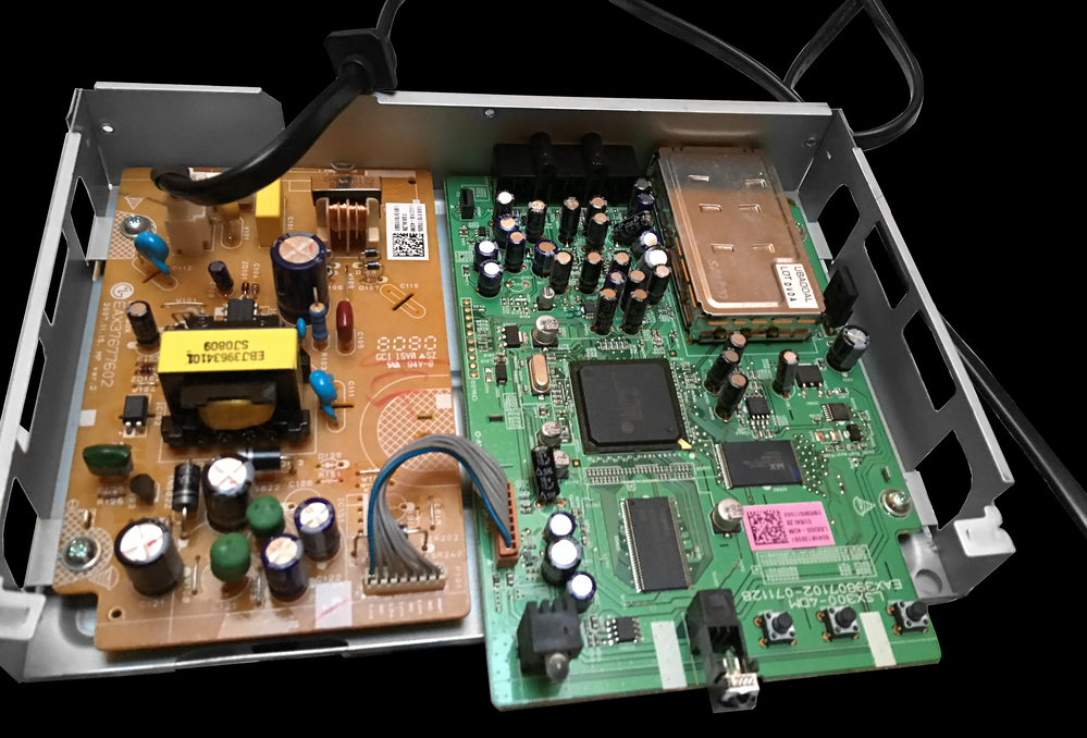 Our first step was to disassemble the assorted converter boxes we had collected. We began by examining three different boxes manufactured by Digital Stream, RCA, and Zenith. One of the first things that we noticed was that the components of each box were soldered to their respective circuit boards, making the replacement of any one part a virtual impossibility. Using serial numbers and, when available, the manufacturer’s name, we searched in vain for service manuals or other information that could shed more light on the various components. We did, however, discover that all three boxes utilised a Thompson TV tuner, the electrical component that receives digital broadcast signals from an external antenna before they move through box to be decoded and converted to analog signals. Our initial external manipulations of the converter box’s electrical components would focus on the TV tuner.