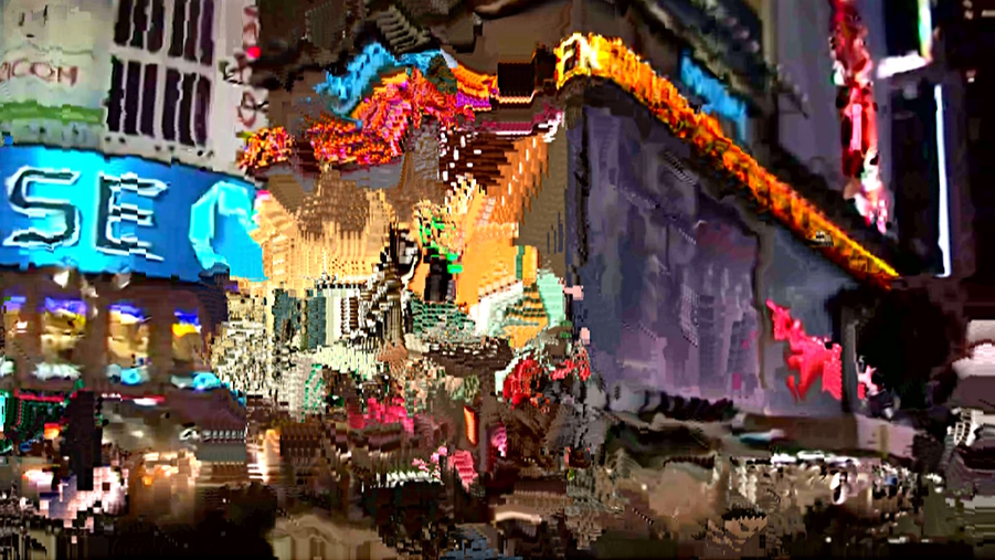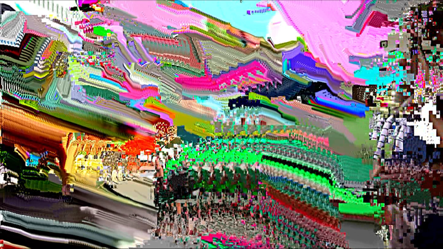 While hex editing and automated apps can produce stunning imagery, real-time datamoshing — a digital corollary to earlier live video synthesising performances — remained the genre’s Holy Grail. In 2008, Eric Souther determined that real-time datamoshing of digital video was possible using the free, open source VLC media player; rhythmically clicking within the application’s video playbar produced typical datamoshing effects, including over-saturated colours, pixel eruption and a smearing of the image.[4] As Jason Bernagozzi notes, ‘the more times you click that same area of the playbar the image will repeat and will appear to shed a history of video “skins” […] The more you do this, the more the colour will saturate and change or datamoshing will occur’ (27). Datamoshing also occurs by simply dragging and holding the playhead on the video playbar and slowly scrubbing across the timeline. While most media player software programmes have incorporated anti-glitch measures to guard against such errors, each new version of VLC datamoshes video files differently, a quirk of the software that artists can leverage according to their own aesthetic preferences.