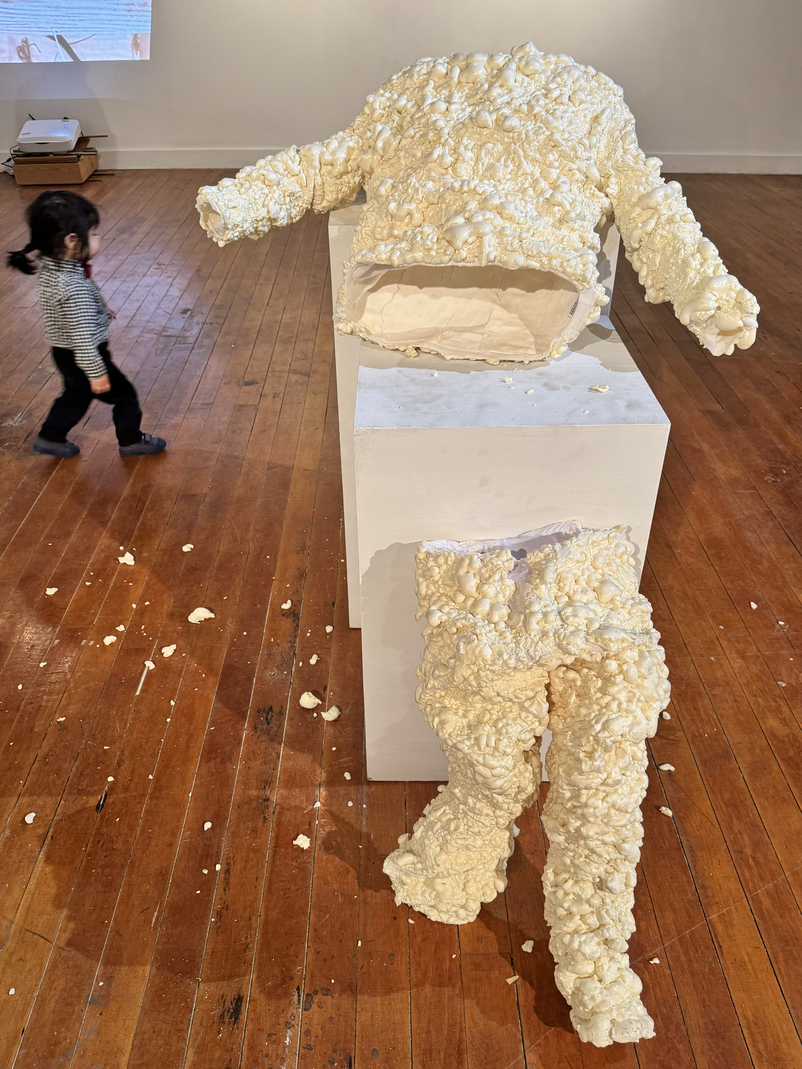 When I presented the performance It’s Natural to the audience for the second time, I applied the foam onto cotton fabric instead of elastane, and the result was a much greater struggle to get inside. The cotton did not give me the space to enter the body as the elastane had, demanding a much stronger physical effort from me. I had not tested it beforehand as I had in previous instances, so when I performed it live in the gallery, the level of challenge, and perhaps exhaustion, added a much more visceral layer to the work. In this gallery presentation, I did not use the spotlight, only the pedestals; however, the ending of the performance became clearer and more defined through the complete removal of the foam body after struggling to inhabit it. In this documentation video, the process of exhaustion and the remnants left at the end of the presentation function as traces of the performance’s ephemerality and of the effort to emerge from that body.
