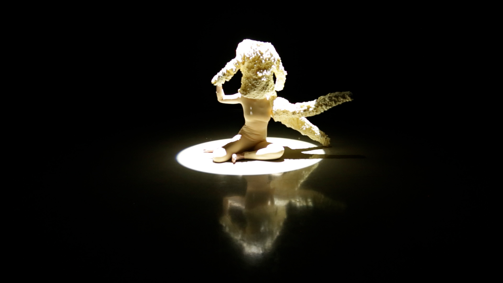 This new relationship between my body and the foam bodies led me to fabricate new molds for applying foam and to use them more as wearable prosthetics that allowed me to enter and exit them with fluidity. As I began to film and watch this new stage of experimentation, I noticed that the reflection of my gestures on the floor was generating another layer of image. This discovery prompted me to experiment with the concept of justaposed layers in different temporalities within video. I began to perform for the camera, exploring interactions between my body and the foam bodies as extensions of myself. Through this process, the accumulation of bodies expanded into layers of image, transforming the documentation into a new choreographic space. From the conventional definition, a prosthesis is understood as an artificial device that replaces a lost part of the body, seeking to restore function, appearance, and quality of life. However, in Rebecca Horn’s work, and in my own experiments with foam bodies, the prosthesis becomes a poetic and performative device. Rather than giving back to the body what has been lost, these prostheses invent extensions that never existed, producing gestures, presences, and relations that destabilize the “natural” body.