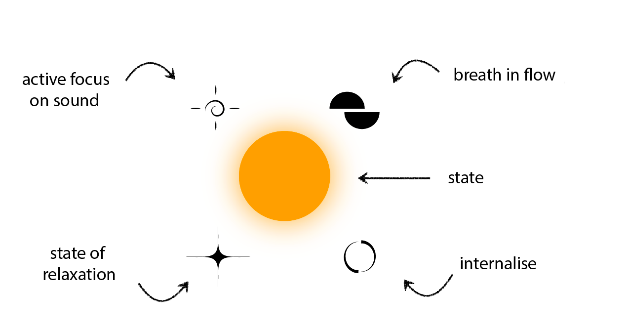 More concretely, the structure of notation that is being developed throughout most of the projects of this research (Artefact 2–4) is conceptually influenced by the notion of verticality of human thought manifestation (Small 1998, 50–63)8 and the spatially compact meanings of ideograms.9 In the notation system, concepts are not notated linearly and in detail, but are encapsulated and condensed into complex, often multidimensional figures, which describe either a state or a process. Each figure contains information about qualities of movement, thought, breath, sensations, texture and space perception. If we take a look at the first version of notation for the singer10 (Fig. 5), at the centre of the figure is the symbol that indicates that the action is to be thought of and carried out as a state, i.e. as a non-goal oriented moment. This main symbol is surrounded by four other signs that refer to the different qualities of the action. 1) Active focus on sound: the focus of the singer should be on shaping the sound that she produces. 2) Breath in flow: the singer should inhale and exhale equally with sound. 3) State of relaxation: the action has to be performed in a relaxed body state, meaning mainly the location where the sound is produced. 4) Internalised action: the focus and the sound are to be kept intimate and to oneself.