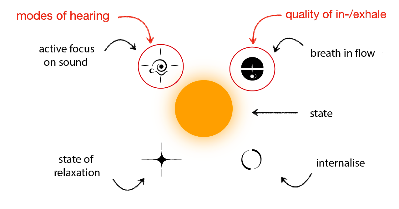 After the observations discussed in the video excerpts of Figs. 3 and 4, it seemed potentially fruitful to integrate two new possibilities of action, or more refined conscious focus into the practice, namely the focus on different modes of hearing, and the different patterns of breathing in flow. At this point, there seems to be a necessity for evolving and refining certain signs in the notation (Fig. 6). The sign that stands for the active focus on sound has to be differentiated, to indicate when the mental focus on sound is to be performed by means of activating the three modes of hearing. Furthermore, the sign expressing that the breathing is in flow would have to indicate more concretely what quality the articulation of this action should have. Thus, variations were developed that give the performer more information about the patterns of the breath in each instance.