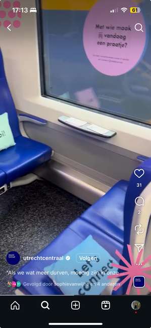Van verbaal contact is geen spraken in treinstel 9479 onderweg naar Amsterdam. Ook het oogcontact word vermeden. Het is alsof de afstand groter dan ooit is. Geen brug die het kan overbruggen geen lijm die de afstand het kan dichten. Behalve die “goedendag meneer, bent u een leuk boek aan het lezen?”