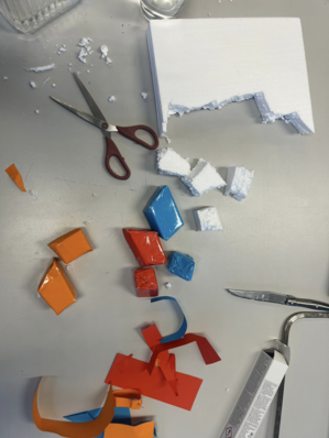 Na de crazy 8 ben ik gelijk aan de slag gegaan met mijn eerste prototype. Ik heb "blokjes" met 4 scheven kanten uit piepschuim gesneden om een gevoel en een beeld te krijgen van de werking hievan.