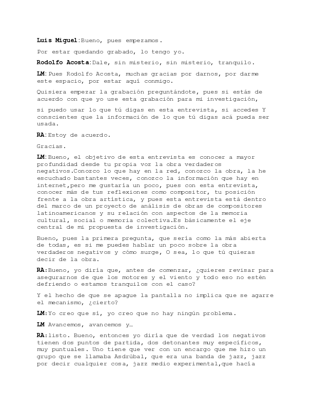 My analysis of True Negatives combines two interconnected approaches: (1) a semi-structured interview with the composer, conducted in Bogotá in June 2024, and (2) a comparative score analysis informed by theory outside the modern/colonial frame.