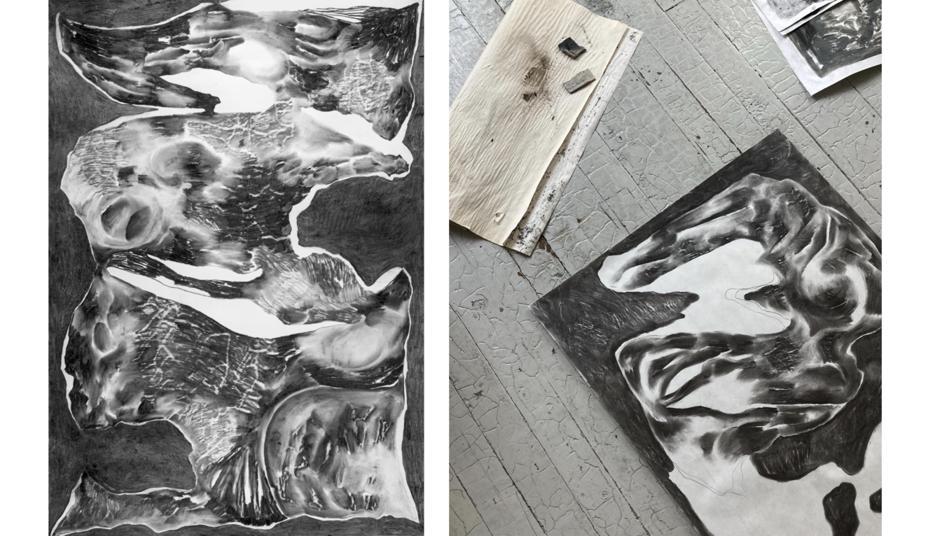 The starting point of my project is a drawn representation of a landscape relief. The impulse to create fusion and landforming drawings emerged during an artistic residency at MUSTARINDA in Finland. It also builds on my previous installation …under the wheel of deformation (2022), where the motif of burdened landscape is further developed. The central theme is an analysis of the relief. It is an entity full of depressions, holes, and wetlands—elements that point to layering, erosion, and the dynamics of natural processes. A bird’s-eye perspective allows the landscape to be perceived as a structure composed of layers whose mutual interaction reflects transformations over time. It also shows their balance between weight and fragility, stability and impermanence.