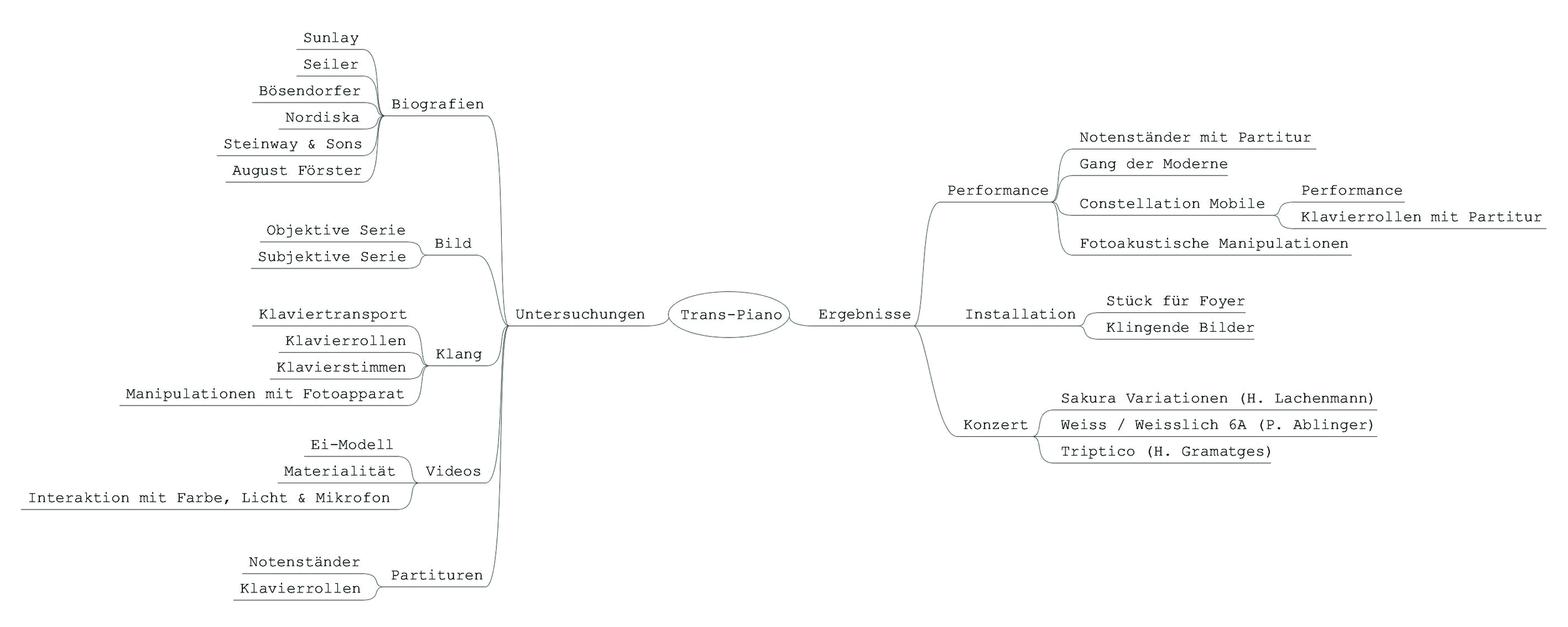 In einem transdisziplinären Prozess im Rahmen des Studiums "Transdisziplinarität in den Künsten" an der Zürcher Hochschule der Künste (ZHdK) habe ich 5 Klaviere auf die Eigen-schaften Bild, Klang und Bewegung untersucht. Dies hat mich zu verschiedenen Darstellungs- und Aufführungsformen wie Performance, Installation und Konzert geführt.