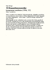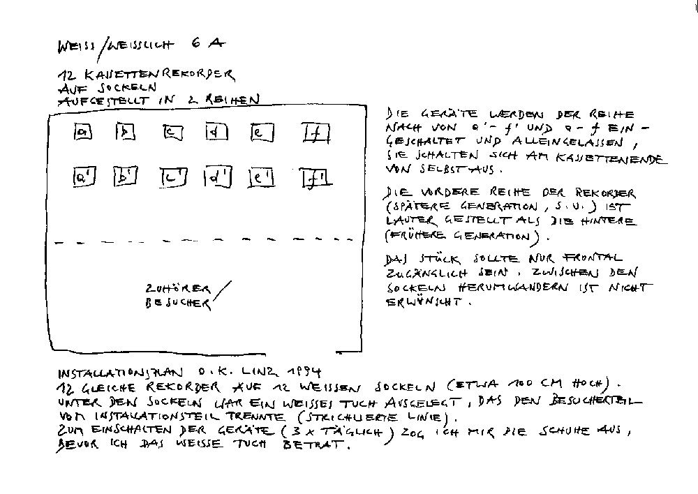 Die Anordnung und Positionierung der Notenständer bilden hierbei eine melodische Linie im Raum (z.B. a-h-d-c-h). Von der Performance ist eine Partitur entstanden, die im Video integriert wurde.
