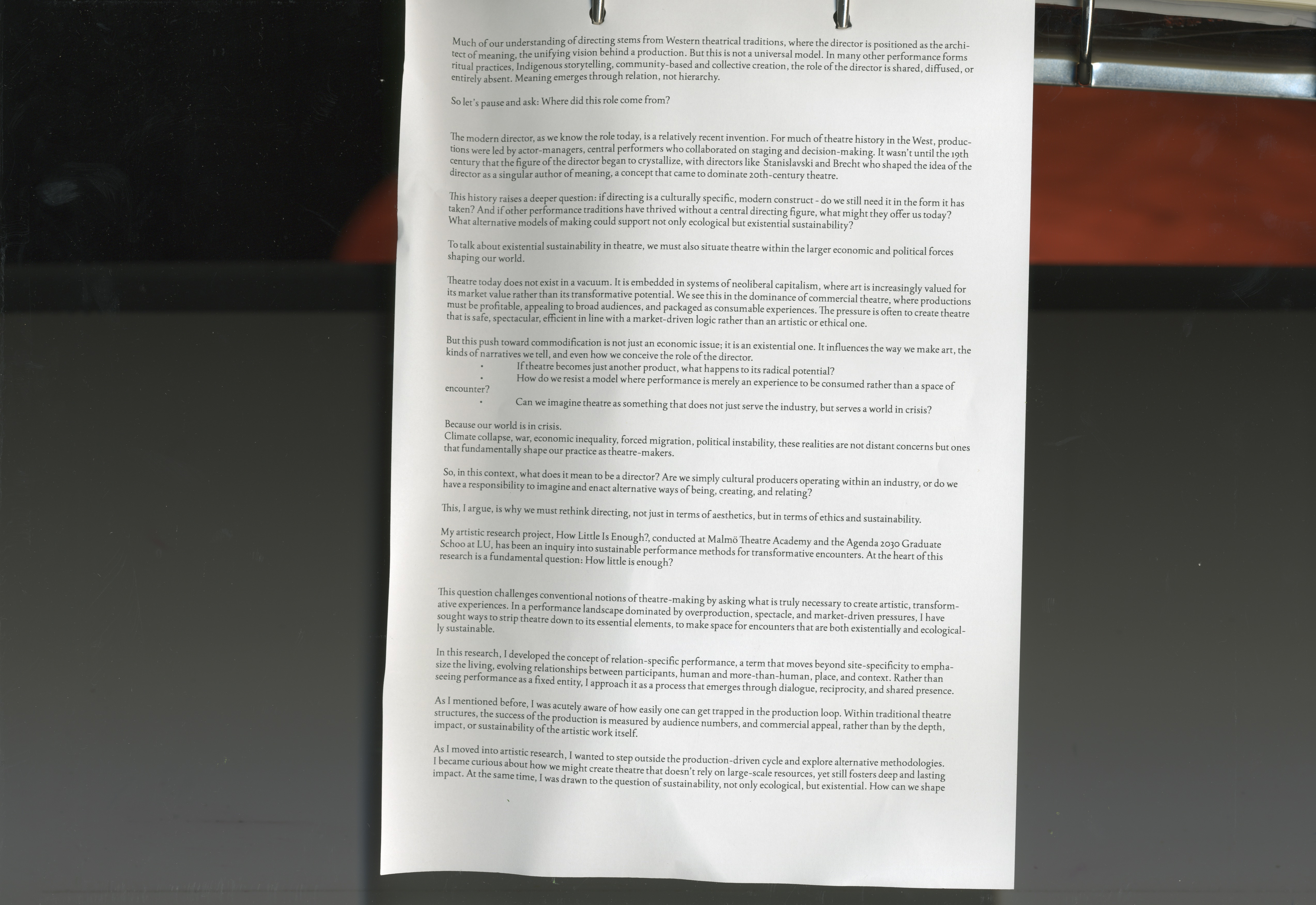 PROJECT DESCRIPTION “Working Title” is an art performance about labor conditions and class structures. The motivation behind the piece is to interrogate the many ways in which work affects us. The boundaries between labor and art are also examined, as the physical and mental demands placed on the performers reflect the burdens of modern working life. The format mirrors a regular workday: the performance lasts eight hours, including a break. It is presented in two versions—a day shift and a night shift. Today, many sectors are marked by rapid change, demands for efficiency and ever-increasing productivity. Which values are prioritised, and which are undermined to meet the needs of such a labor market? In the piece, structural challenges will be studied and observed through scenarios acted out on stage. Some examples of questions that will be used to form these scenarios: -At what cost do you actually sell your time? -What kind of value is, beyond the monetary, created for those who buy your time? -In what ways, physically and mentally, do you experience your labouring hours, after you have clocked out? The performance will explore themes such as: - Monotony and repetition as fundamental elements of labor - Power dynamics in the workplace and how privileges are maintained and reinforced - The body’s needs in relation to work: illness, disabilities, menstruation, and pregnancy - The physiological consequences of labor - The value of time as an economic and social divide - The close link between economic stability and mental health In a time when the job market is shaped by rapid technological development, climate change and an uncertain future, thinking through alternatives for how to organise ourselves has become crucial. With this performance, we aim to dig into the mechanisms at stake in order to hopefully be able to both raise questions and think deeply about how we may face the challenges ahead collectively. A dynamic, experimental and collectively driven form of artistic expression is combined with societal critique. We believe in art as a way of adding to the discourse in poetic manners, activating questions through embodied experiences. With this unique format, we hope to open new perspectives on what labor means for individuals and society—and what values we wish to build our common future upon.