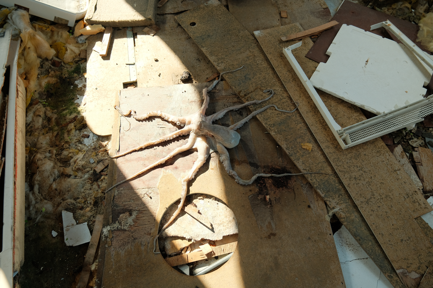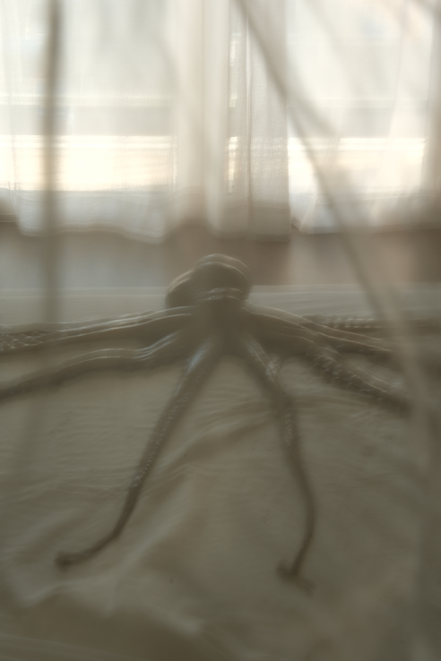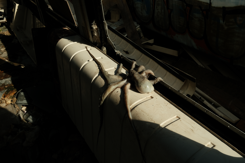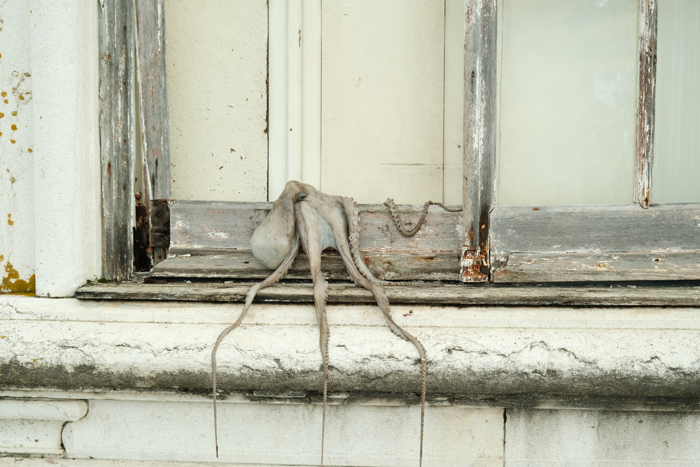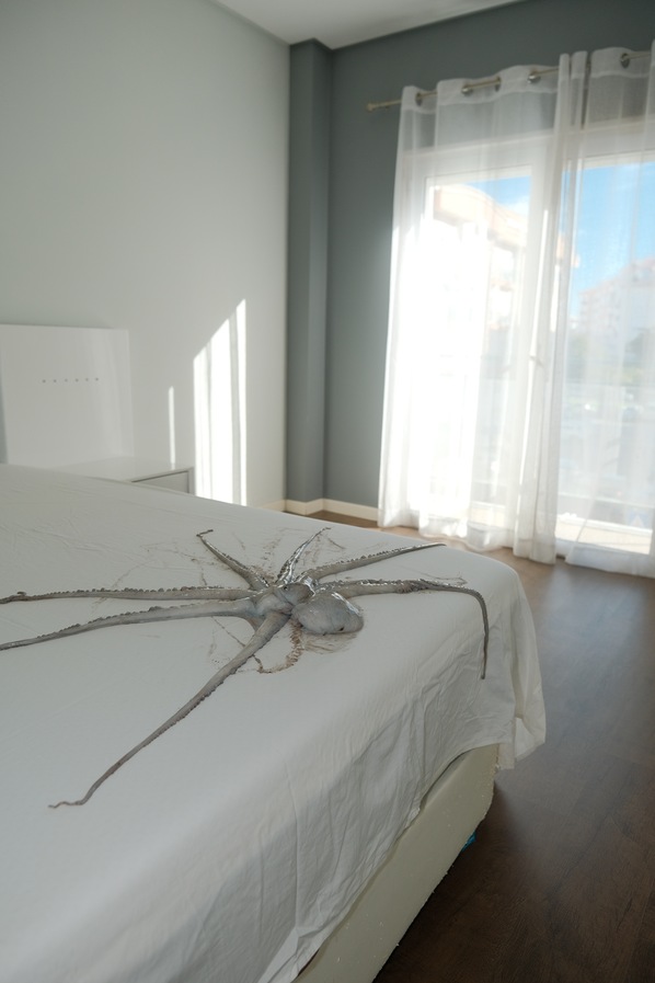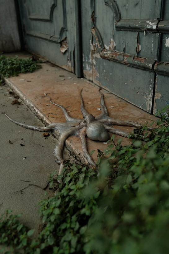 When the Sea Invades the House displaces a real octopus from the ocean into bedrooms, windows, cars and ruins. Its tentacular body embodies ecological grief, dragging the sea into spaces where human life unfolds. Each photograph is an archival fragment of mourning, recording the dissonance between a body that belongs to the depths and the surfaces where it is forced to appear. The final image, marked by a black tear, crystallises this grief as wound and testimony. It is the ocean itself that mourns, silently infiltrating the everyday.