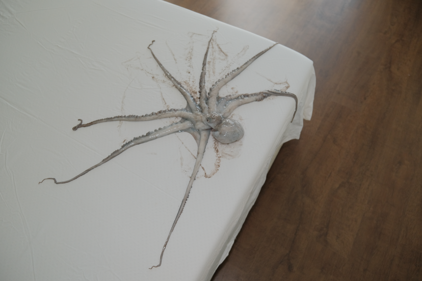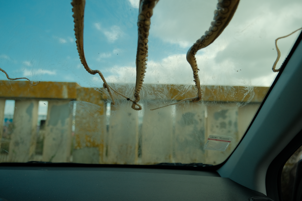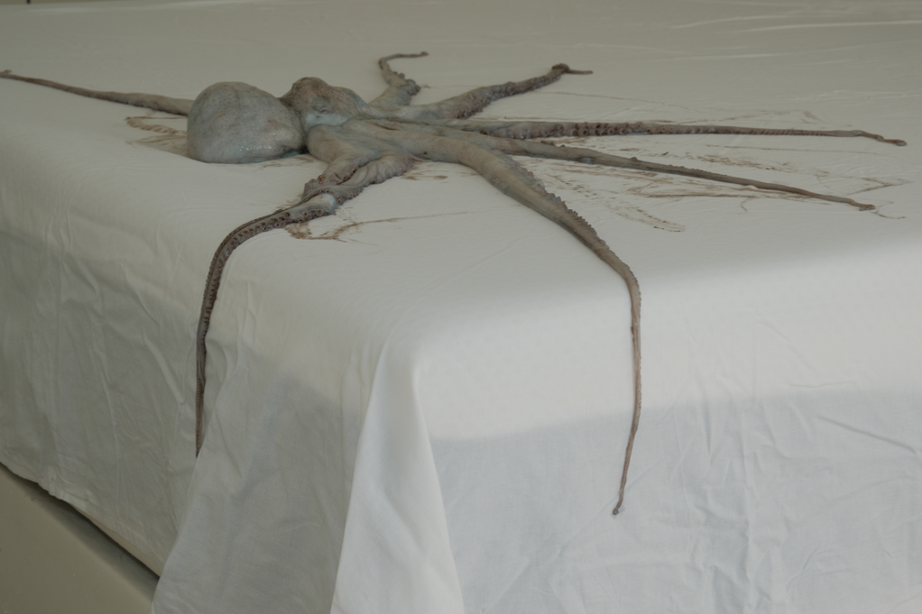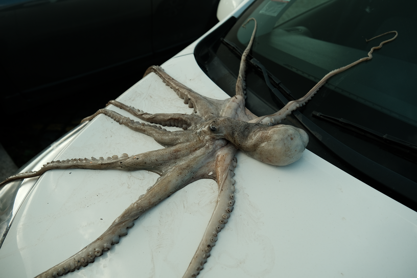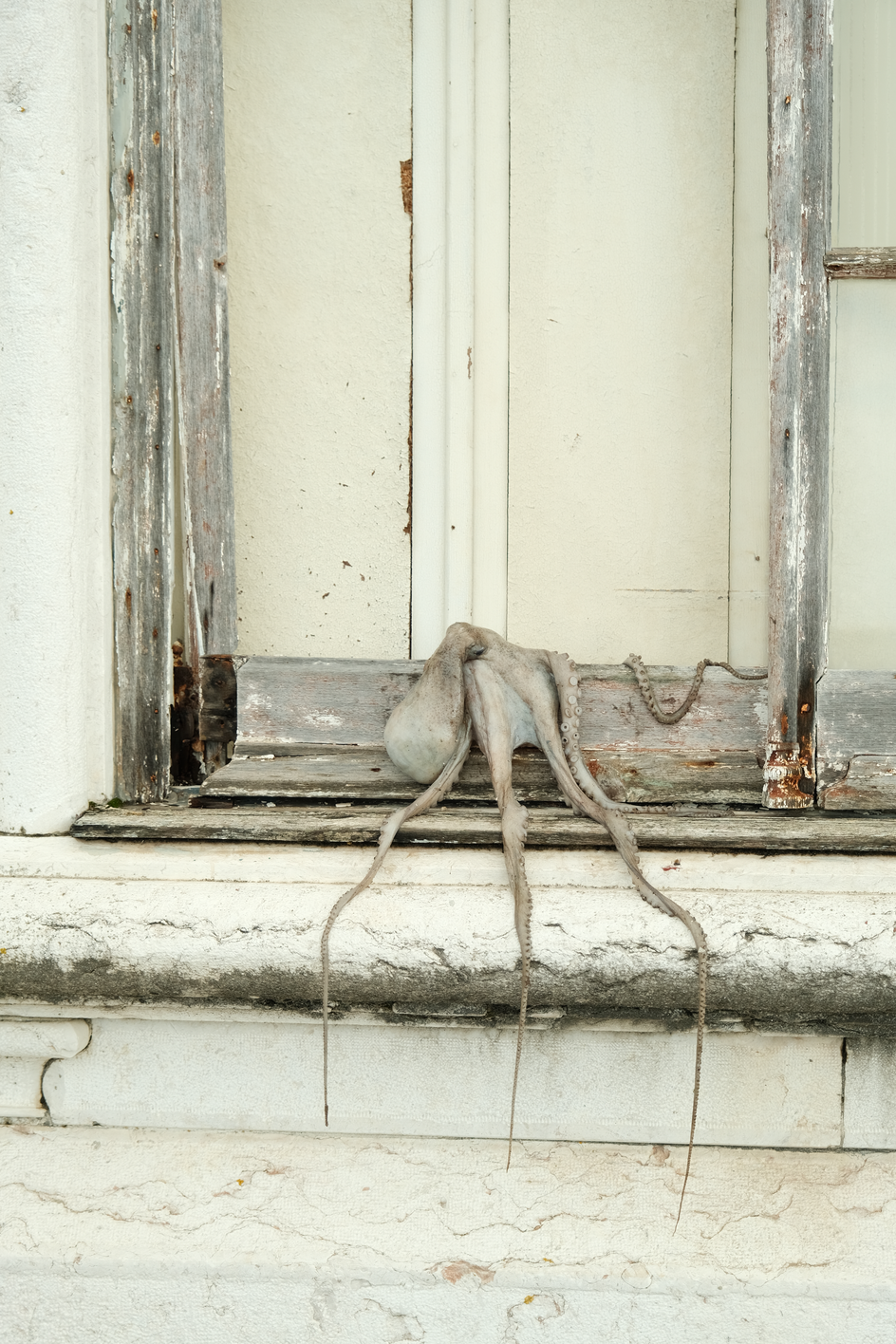 When the Sea Invades the House displaces a real octopus from the ocean into bedrooms, windows, cars and ruins. Its tentacular body embodies ecological grief, dragging the sea into spaces where human life unfolds. Each photograph is an archival fragment of mourning, recording the dissonance between a body that belongs to the depths and the surfaces where it is forced to appear. The final image, marked by a black tear, crystallises this grief as wound and testimony. It is the ocean itself that mourns, silently infiltrating the everyday.
