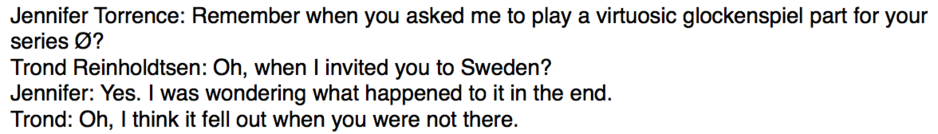 In each piece I credit my collaborator with the concept; it is up to debate whether to credit them for musical composition. Very often what we can understand as composition manifests as the process of ordering events, not in the sense of creating distinct structures but in the sense of deciding what goes where and when. Very often the pieces became as performative as they are musical. The devising process complemented this artistic ambiguity.