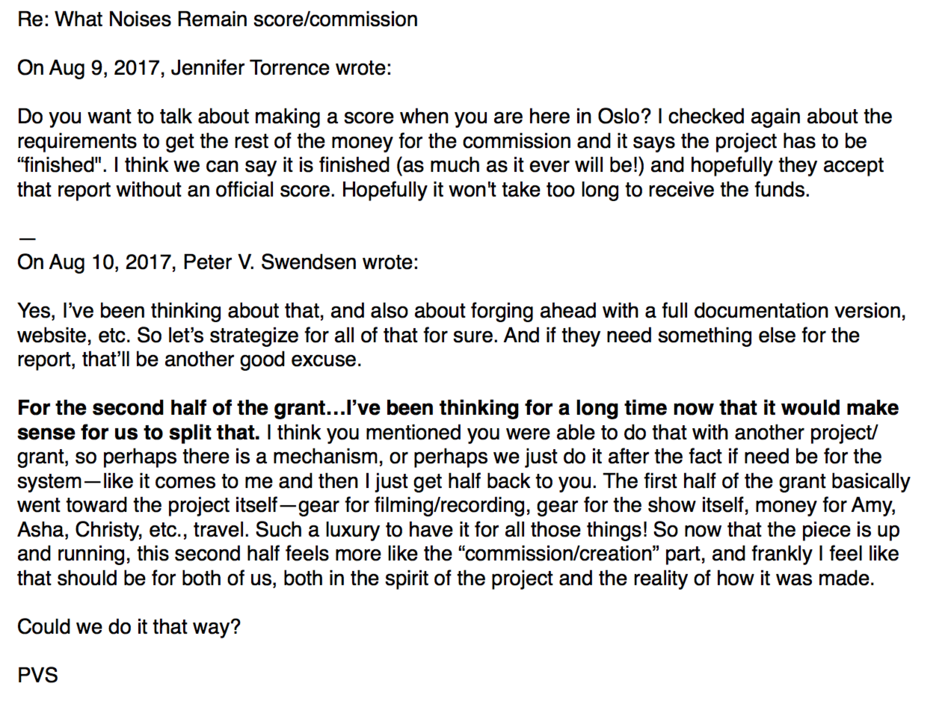 When a shared commission fee did not seem right for a particular project or did not emerge out of a shared dialogue, it was important for me as the "Performer" to ensure my credits be explicitly noted in scores and documents.