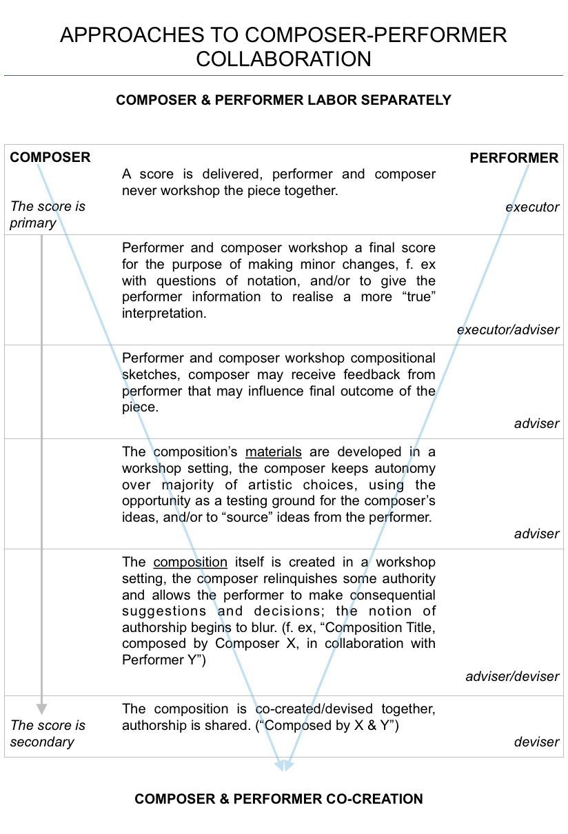 Under the column of the Composer, there is an arrow illustrating the priority of the score within the collaborative process. The more separate the generative process, the more important the score becomes as a tool for communication between composer and performer. The more integrated the working process between composer and performer, the less important the score becomes as a tool for communication, however the score can remain a tool to preserve the musical work, as is also the case in more separate generative processes.