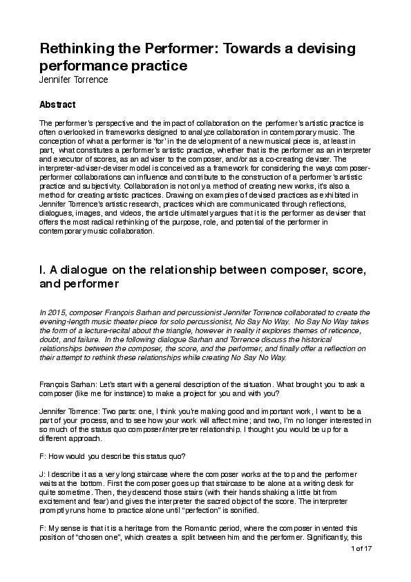 The performer’s perspective and the impact of collaboration on the performer’s artistic practice is often overlooked in frameworks designed to analyze collaboration in contemporary music. The conception of what a performer is ‘for’ in the development of a new musical piece is, at least in part, what constitutes a performer’s artistic practice, whether that is the performer as an interpreter and executor of scores, as an adviser to the composer, and/or as a co-creating deviser. The interpreter-adviser-deviser model is conceived as a framework for considering the ways composer-performer collaborations can influence and contribute to the construction of a performer’s artistic practice and subjectivity. Collaboration is not only a method of creating new works, it's also a method for creating artistic practices. Drawing on examples of devised practices as exhibited in Jennifer Torrence’s artistic research, practices which are communicated through reflections, dialogues, images, and videos, the article ultimately argues that it is the performer as deviser that offers the most radical rethinking of the purpose, role, and potential of the performer in contemporary music collaboration.