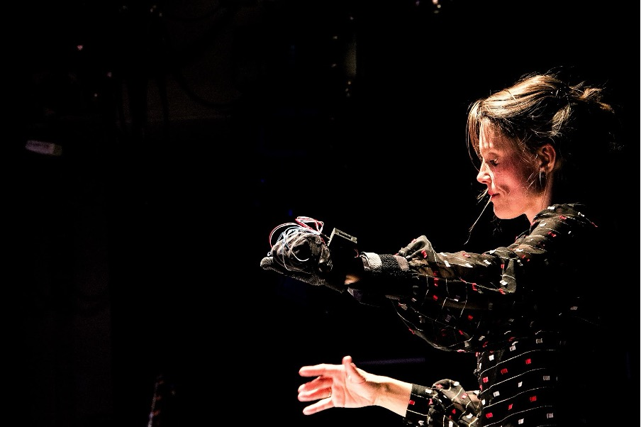 Thordarson had developed an electronic conductor’s glove (Con Glove) as a tool for conductors to be able to alter the musicians’ amplified sound directly. I conducted with the electronic glove on the world premiere of Thordarson’s piece Kuuki no Sukima – Between the air: a through composed mixed music composition for ensemble and interactive conductor with Trondheim Sinfonietta on the symposium “The Virtuoso Listener” at Dokkhuset in Trondheim (Fig. 1).