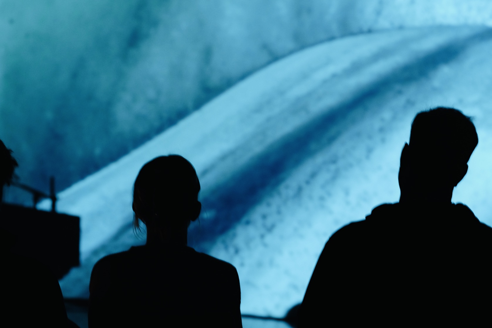 In the creation of Hrafntinna/Black Obsidian we started with scenes based on nature elements like deep ocean, earth surface, ice and air, and worked with these elements in an abstracted way through improvisation, conversation and imagination to search for textures, materialities, sounds, colours, choreographic expressions and visual images (cf. Fig. 6 and 7) that in some way spoke to each other as well as to the element of nature we were working with. In Fig. 6, the performers are watching an excerpt of the art video during the process, a video that was shot in an Icelandic ice cave.