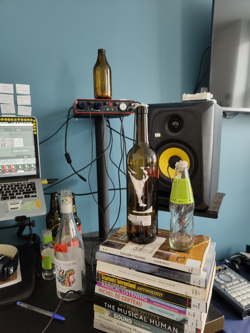 Multiple seperate field and object recordings played at bottles with omni microphones as they sit inside two bottles. Those subsequent recordings have an EQ Peak Filter applied.