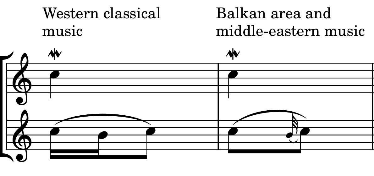 A new technique, very different from the classical way of playing keypads, which I have developed over time, concerns the execution of lower mordents. It was necessary to develop this new technique because the way of performing mordents in many styles of makam-music is completely different from the classical way used in Western classical music. In Western classical music, the mordent is performed in a more relaxed and fluid manner, giving the three notes of the mordant a similar duration and the same dynamics (Ex. 13 left). In contrast, in many styles of music from the Balkan area and the Middle East, the mordant is performed in a very articulate, energetic and rhythmic manner. The grace note has a very short duration and only serves to divide the two equal notes instead of the tongue stroke (Ex. 13 right).