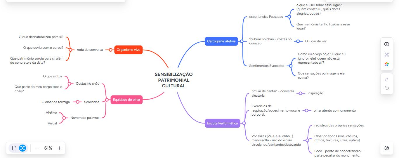 A etapa seguinte consistiu-se na elaboração de um mapa mental coletivo, no qual foram registrados os elementos perceptivos, históricos e sensoriais experienciados durante a visita ao patrimônio. Essa prática buscou não apenas organizar informações, mas ressignificar a experiência através de conexões entre memória, espaço e afetividade, bem como traçar percursos sensíveis de ressignificação patrimonial a serem colocados em prática com os discentes do curso de mestrado supracitado e da comunidade local do Monumeto (o Farol). O exercício de construção coletiva do mapa mental nos revelou que a produção de conhecimento está no próprio ato da experiência, que é preciso antes de tudo experienciar para refletir. Nesse sentido, as linhas e palavras inscritas no diagrama não são meras representações, mas sim constituintes de traços de um pensar-fazendo - quase uma parafrase de um "sentir/pensar" de Josefina Azócar (2024) - em que as associações gráficas carregam a experiência viva e orientam percursos sensíveis. O mapa mental, portanto, emerge como ferramenta híbrida, já que transita entre a tentativa de conceituação e a inscrição do indizível, dando forma visual e relacional àquilo que, de outra maneira, permaneceria apenas no plano da experiência tácita.