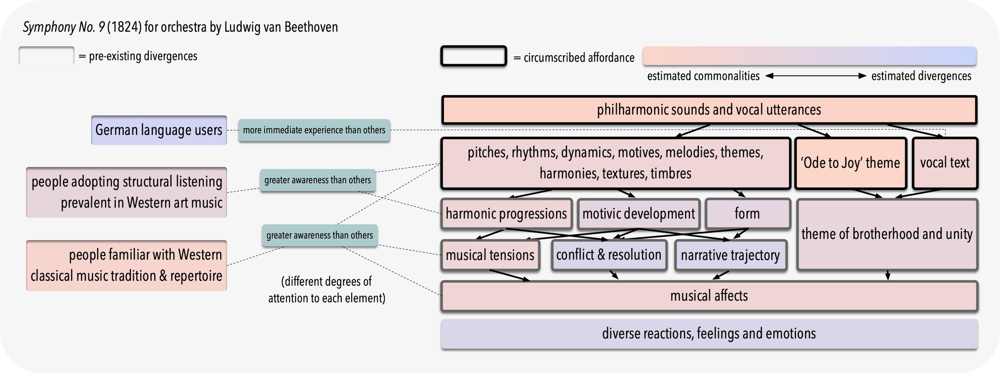 Ludwig van Beethoven’s Ninth Symphony, composed within the cultural context of 19th-century Europe, serves as a prime example of Western art music from the common practice period. As illustrated in Fig. 1,7 the symphony’s circumscribed affordance encompasses the stimuli and abstractions conventionally recognised as musical elements of the era. These elements, including the notated abstractions of pitch, rhythm, harmony, dynamics, tempo and instrument timbre, are widely understood and practised by musicians, critics, and audiences. They are further combined into themes, motifs, and structured forms, all contributing to the teleological shaping of tension and release within the tonal system, culminating in a narrative trajectory characteristic of 19th-century compositions.8