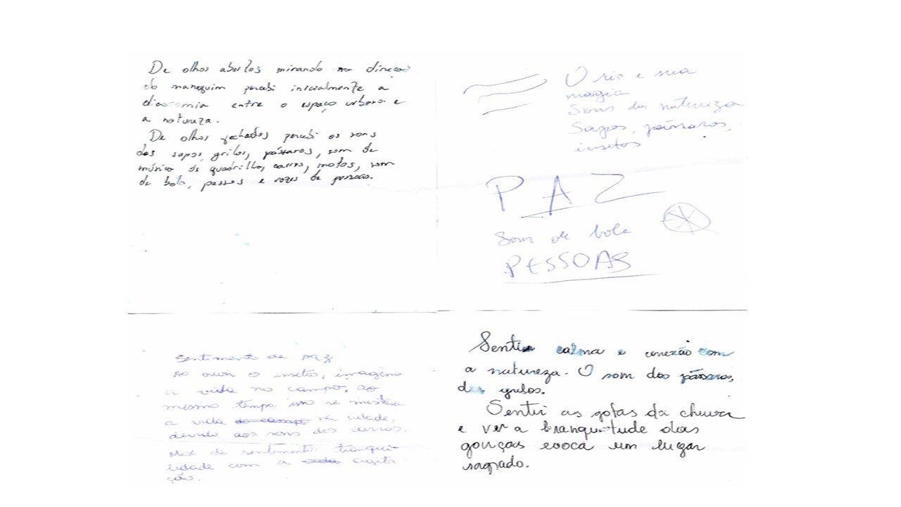 Escuta sensível Registrar as impressões sonoras em quatro locais do espaço. Considerando a paisagem sonora. O registro poderá ser feito de olhos vendados. Uma pessoa pode mediar e escrever as impressões das pessoas de olhos vendados. Essa ação poderá ser feita com o próprio grupo e com as pessoas que estejam circulando no lugar. |
