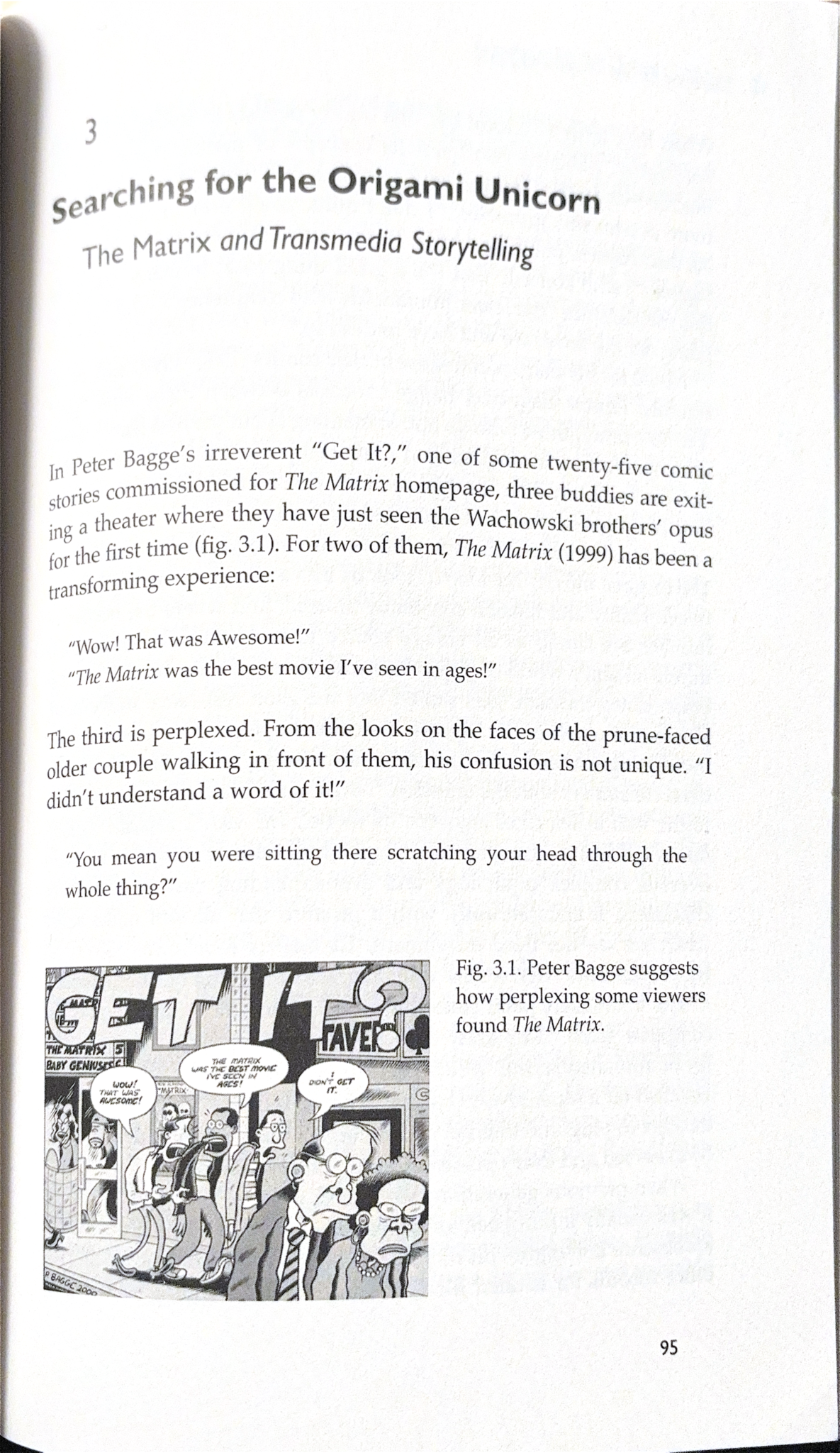Pro naše téma je zvlášť důležitá jeho kapitola Searching for the Origami Unicorn, v níž představuje pojem transmedia storytelling. Jenkins zde ukazuje, že transmedia nelze zaměňovat s pouhou adaptací. V adaptaci se jeden příběh převádí do jiné mediální formy (kniha – film – hra), ale základní narativ zůstává stejný. Transmedia naproti tomu znamená, že jednotlivá média přinášejí do celku nové prvky. Divák, který sleduje pouze jeden kanál (například film), dostane jen část, ale úplný obraz získá teprve propojením všech mediálních fragmentů. Tak vzniká komplexní fikční svět, který by v jediné mediální formě nemohl existovat.