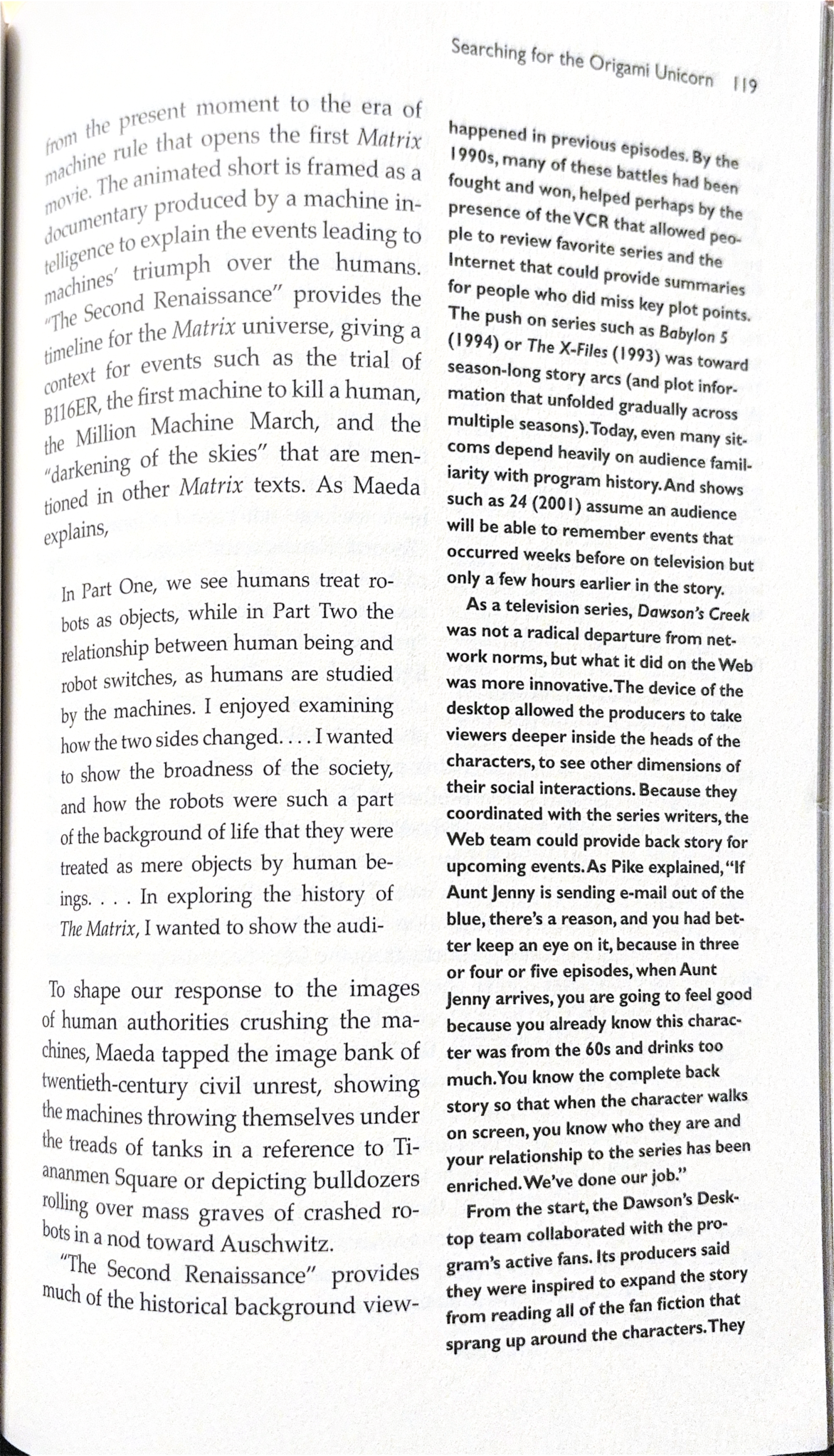 Henry Jenkins ve své knize Convergence Culture zdůrazňuje, že tento proces je především kulturní: publikum není pasivním příjemcem, ale aktivně propojuje fragmenty a rozvíjí příběh. Zvláštní pozornost jsme věnovali kapitole Searching for the Origami Unicorn, která transmedia storytelling definuje a odlišuje od klasické adaptace.
