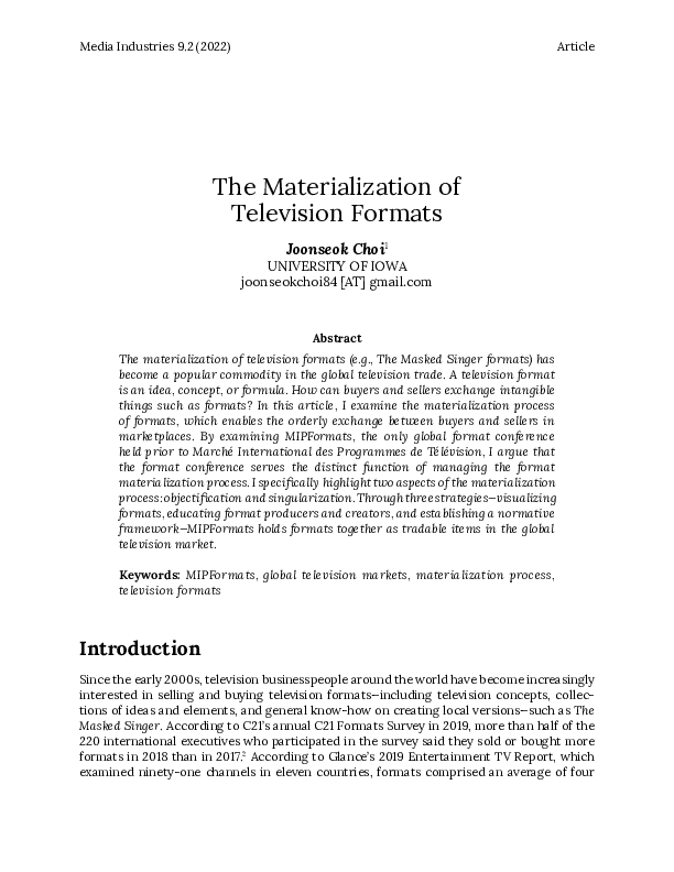 Choi, Joonseok (2022). The Materialization of Television Formats. Media Industries Journal 9(2).