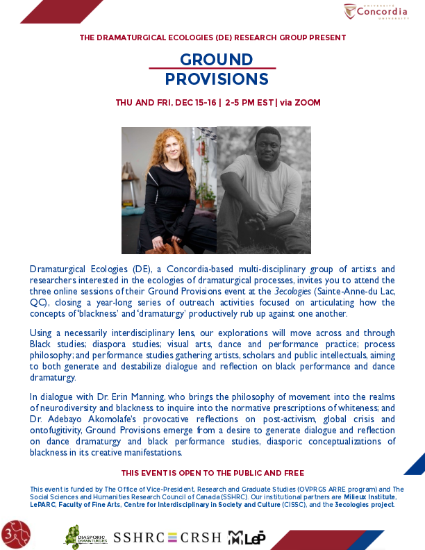 In dialogue with Dr. Erin Manning, whose work brings the philosophy of movement into relation with neurodiversity and Blackness to question the normative prescriptions of whiteness, and Dr. Adebayo Akomolafe, whose thinking on post-activism, global crisis, and ontofugitivity challenges inherited political imaginaries, Ground Provisions emerged as a space for diasporic reflections on Blackness, creative process, and collective study.