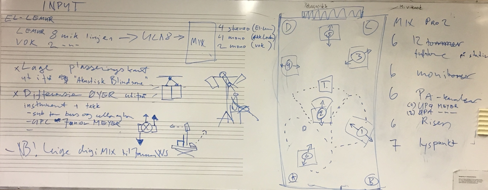 BH: Det romlege aspektet er kanskje det eg er mest fornøgd med, rett og slett fordi det vart løyst så effektivt, med kombinasjonen av scenografi og høgtalarplassering. Sammenhengen mellom ønsket om at publikum skal få ei oppleving av øyene isolert, samtidig som dei har ein følelse av rommet som heilhet. At me valde å skru ned volumet, og arbeida i grensa mellom akustisk og forsterka lyd, synest eg også fungerte veldig bra. Slik sett vart oppsettet ein komplett bastard, samanlikna med standardiserte multikanalsoppsettet.