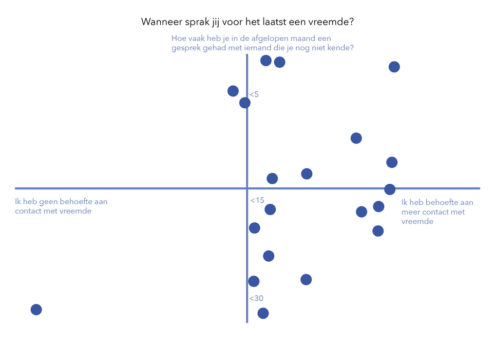 De dotvoting bestond uit een raster waarbij op de verticale as werd gevraagd hoe vaak deelnemers in de afgelopen maand met een onbekende een gesprek hadden gehad, en op de horizontale as of ze meer of minder behoefte hebben aan contact met onbekenden. Deelnemers moesten hierbij goed nadenken met wie ze daadwerkelijk hadden gesproken en vroegen zich af of gesprekken tijdens werktijd ook meetelden.