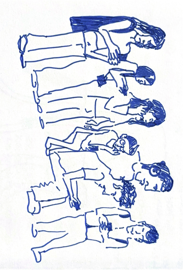 In deze tekeningen heb ik alledaagse observaties vertaald naar snelle schetsen. Ze tonen mensen die wachten op het openbaar vervoer. Samen, maar toch alleen. Wat me opviel, is hoe vaak we de tijd tussen vertrek en aankomst opvullen met onze telefoon. Blikken zijn naar beneden gericht, bewegingen herhalen zich, de ruimte lijkt stil te vallen.