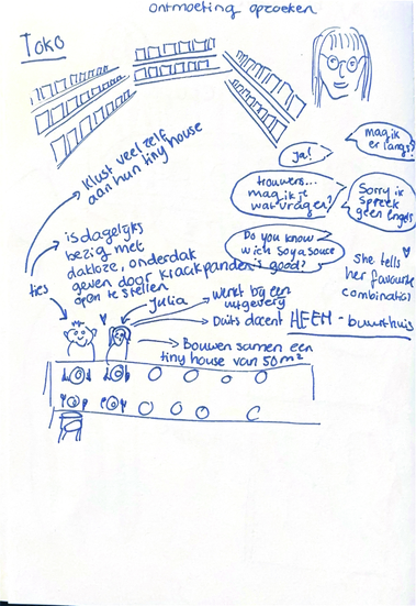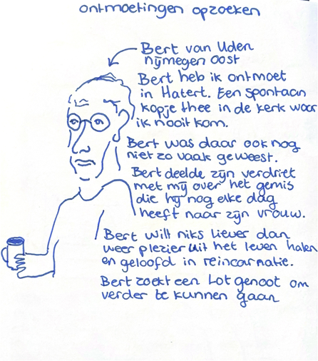 Naast deze observaties maak ik ook tekeningen van situaties waarin ik wél iemand heb ontmoet. Dat kunnen korte momenten zijn of gesprekken die wat langer duren. Steeds vaker zoek ik zulke situaties bewust op: ik ga naar plekken waar ik normaal niet snel kom, juist om te ervaren hoe ontmoeting kan ontstaan buiten mijn vertrouwde context.