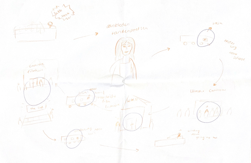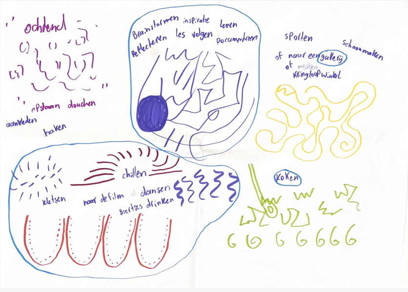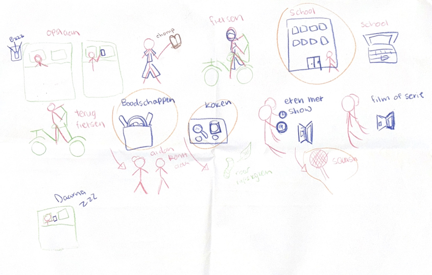Om beter te begrijpen waar mensen ruimte ervaren voor ontmoeting in hun dagelijkse routines, heb ik met drie deelnemers een Day in the Life-sessie gedaan. Hierbij tekenden zij een typische werkdag, inclusief hun activiteiten en ritmes.