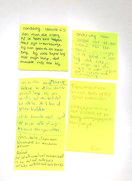 Na het bespreken van het thema en het tekenen van hun Day in the Life vroeg ik deelnemers ook om hun laatste interactie met een vreemde op te schrijven. De inzichten laten zien dat ontmoetingen vaak via bestaande netwerken of bekende contexten plaatsvinden, maar ook dat onverwachte momenten ontstaan in alledaagse situaties zoals het openbaar vervoer,